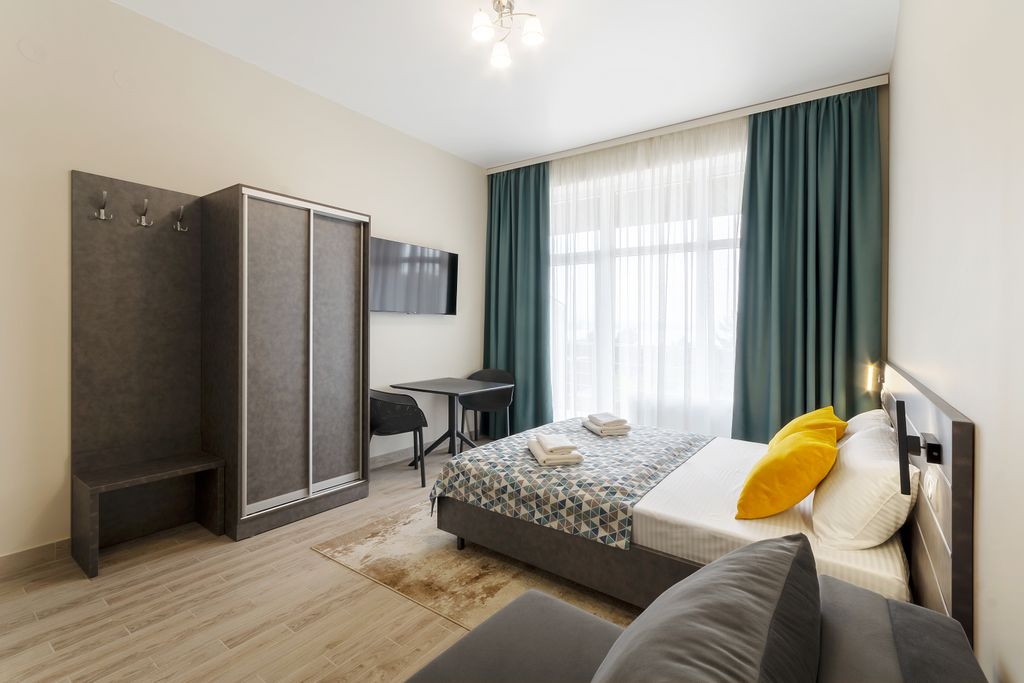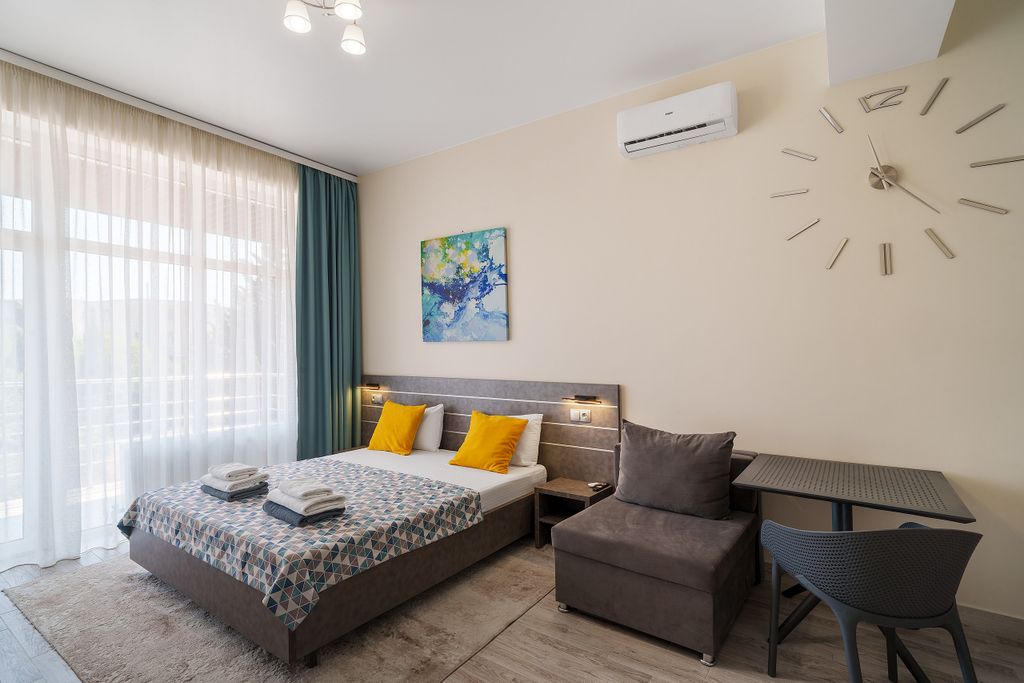 Гостевой дом расположен в зелёной зоне рядом с аквапарком. Всего через 10-15 минут вы окажитесь на галечном пляже или в центре набережной Алушты. К вашим услугам шесть комфортабельных, полностью укомплектованных студий. В каждой студии кондиционер, smart tv, сейф, холодильник, микроволновая печь, электрический чайник, кухонный уголок с посудой, фен, тапочки, косметические принадлежности, набор полотенец (в т. ч. - пляжные). Не территории оборудована зона барбекю со всем необходимым. Возможна парковка вашего автомобиля. При бронировании уточняйте этаж вашего номера.