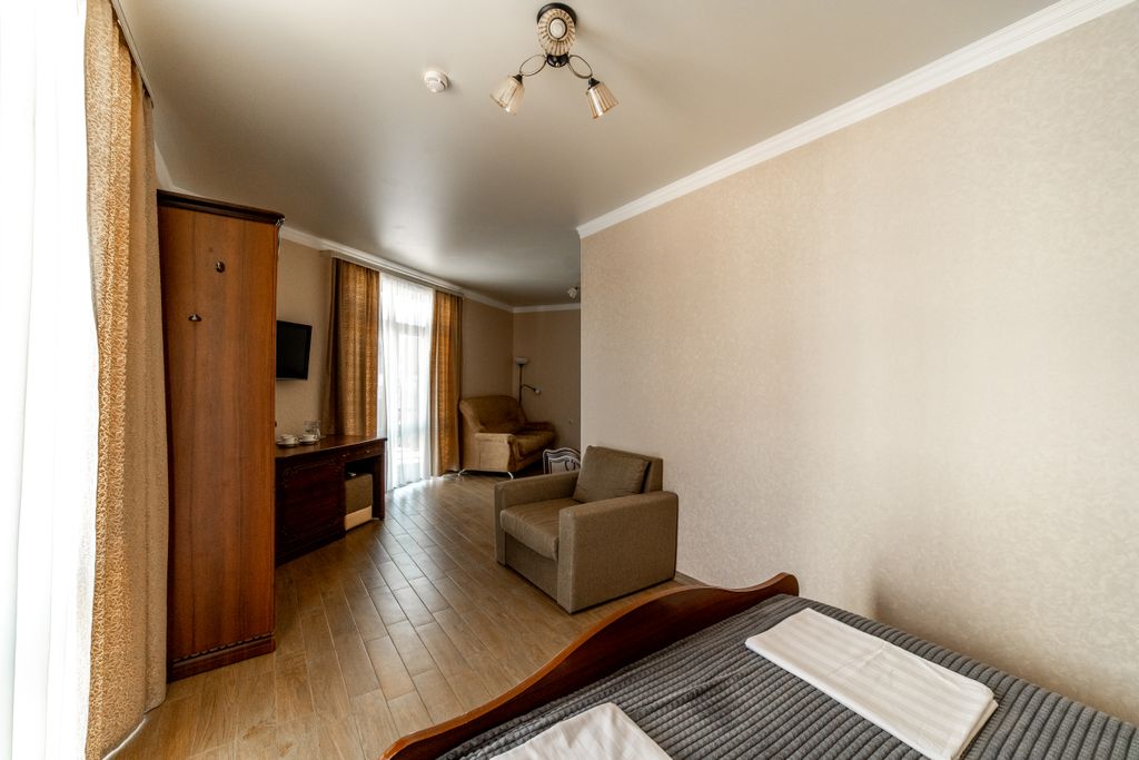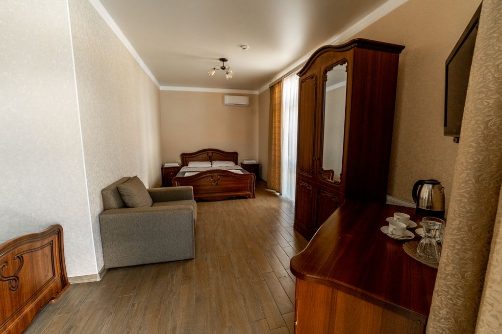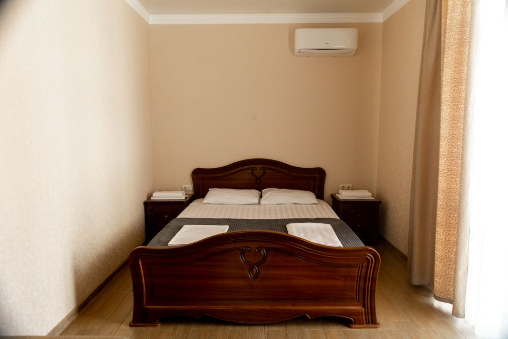 Расположенный всего в 700 метрах от лазурного берега черного моря, наш гостевой дом предлагает идеальное сочетание уединения и доступности к основным достопримечательностям поселка. Тихая улочка, на которой он расположен, позволит вам насладиться спокойствием и безмятежностью, в то время как близость к центру обеспечит лёгкий доступ к магазинам, ресторанам и развлечениям. Мы предлагаем 12 комфортабельных номеров, каждый из которых оснащен всеми необходимыми удобствами для вашего приятного пребывания. В каждом номере есть собственный санузел, удобные кровати и современная мебель, создающие атмосферу домашнего уюта. В каждом номере: телевизор, кондиционер, холодильник, чайник, фен. Приборы для приготовления чая или кофе. Предоставляются бесплатные гигиенические принадлежности: мыло, шампунь, гель для душа. В каждом номере нашего отеля работает бесплатный wi-fi. Кроме этого, в гостевом доме имеется постирочная комната, общая кухня для самостоятельного приготовления пищи, столовая, котор