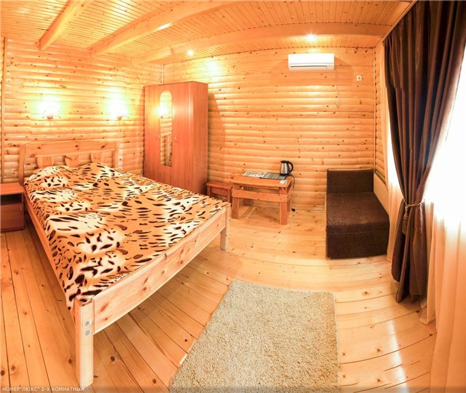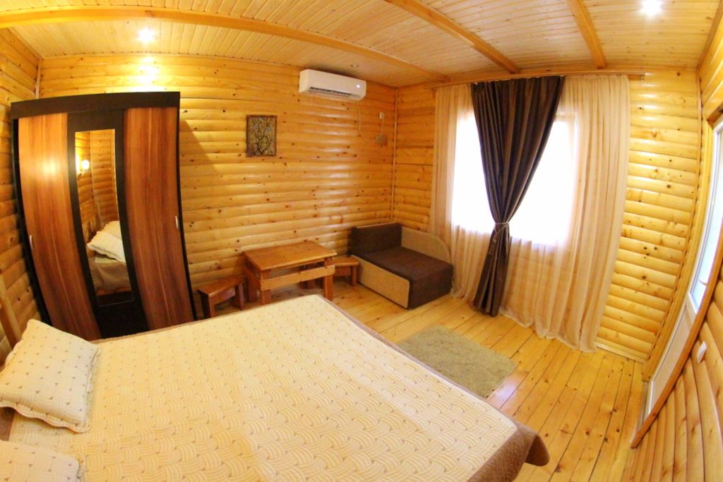 Частное домовладение, эко-дом расположен в районе аквапарка крымского курорта Судак, у подножия горы Алчак. Дом построен полностью из ели. Проживание в экологически чистом доме в сочетании с морским воздухом, близость моря с пляжами и центральной набережной, путь к которым по равнинной местности займет всего около 6-8 минут (450 метров) – немаловажные факторы для полноценного отдыха и оздоровления! Гостевой дом предлагает для проживания комфортабельные комнаты. Каждая комната оснащена мебелью: кроватями из натурального дерева с ортопедическим матрасом и постельными принадлежностями, плательными шкафами, прикроватными тумбочками, журнальными столиками, кондиционером сплит-системы, телевизором, холодильником, электрочайником, санузлом с душевым боксом и набором полотенец. Холодная и горячая вода подается круглосуточно. Кабельное телевидение, бесплатный Wi-Fi, стиральная машина, утюг. Бесплатная автостоянка на закрытой территории. На территории эко-дома беседка-столовая из натураль