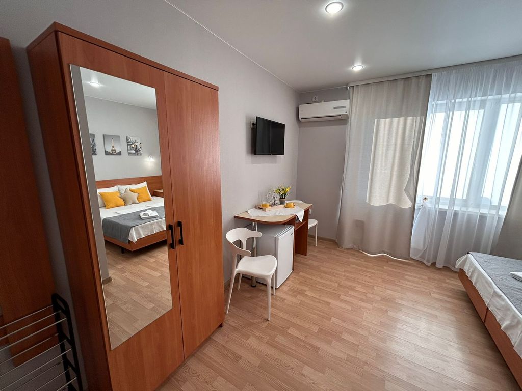 Сдаю в частном гостевом доме двухместные и трёхместные комнаты для проживания. В комнате: одна двуспальная кровать или две односпальные кровати, прикроватные тумбочки, туалетный столик, стульчик, телевизор, шкаф для одежды, сплит система. Туалет с санузлом и душем. Постельное бельё и комплект полотенец. Имеется выход на балконы. Расположены на этаже: холодильник, кулер с холодной и горячей питьевой водой, микроволновая печь, гладильная доска. Интернет Wi Fi подключен. Расстояние до пляжа 950 метров (15-20 минут ходьбы)