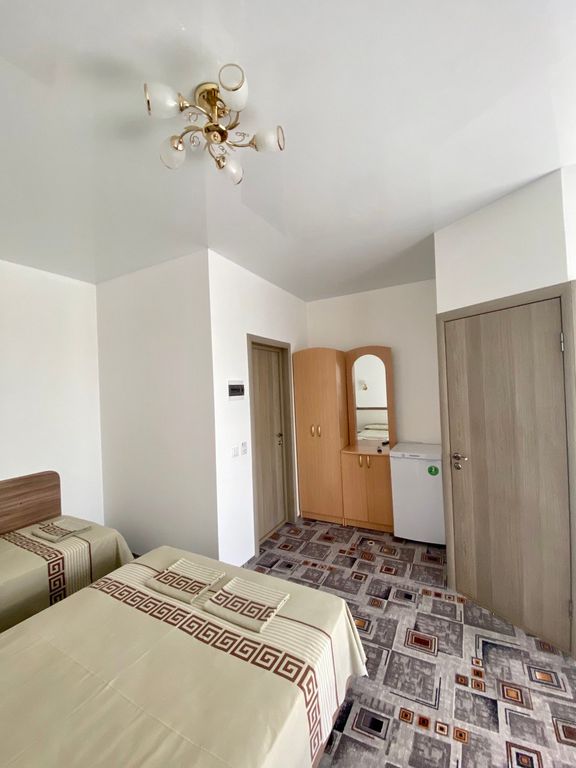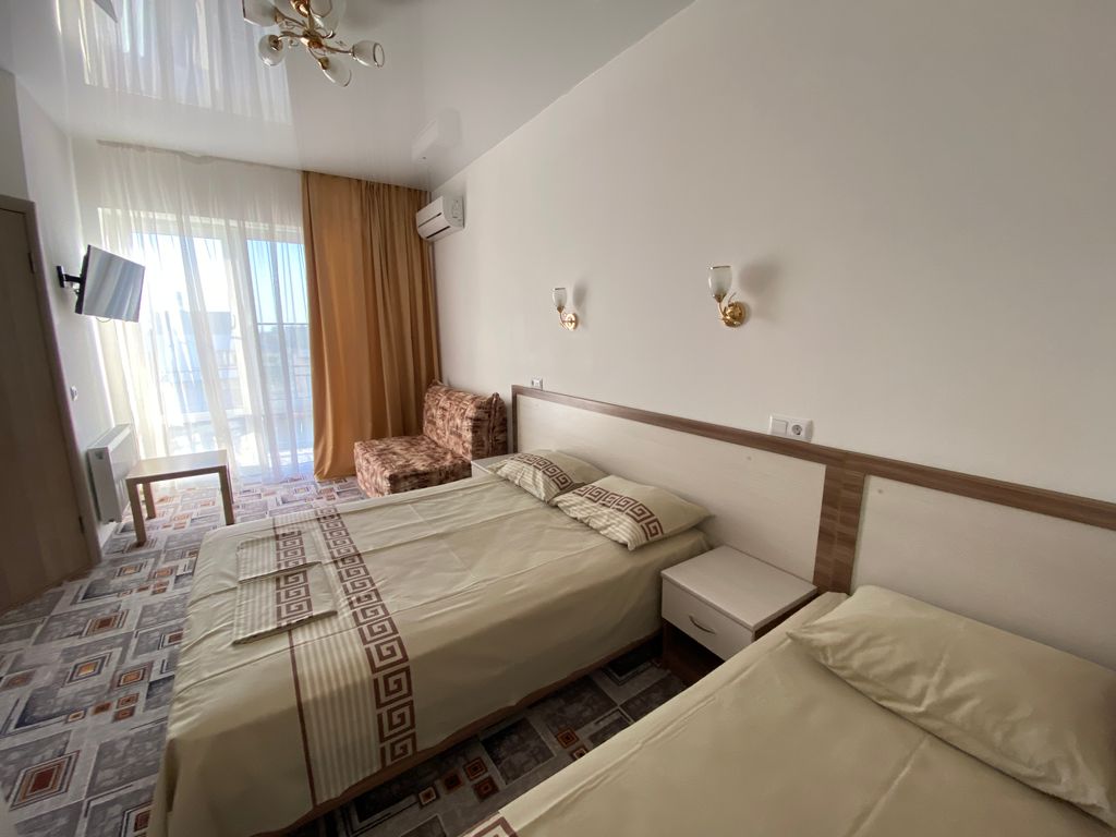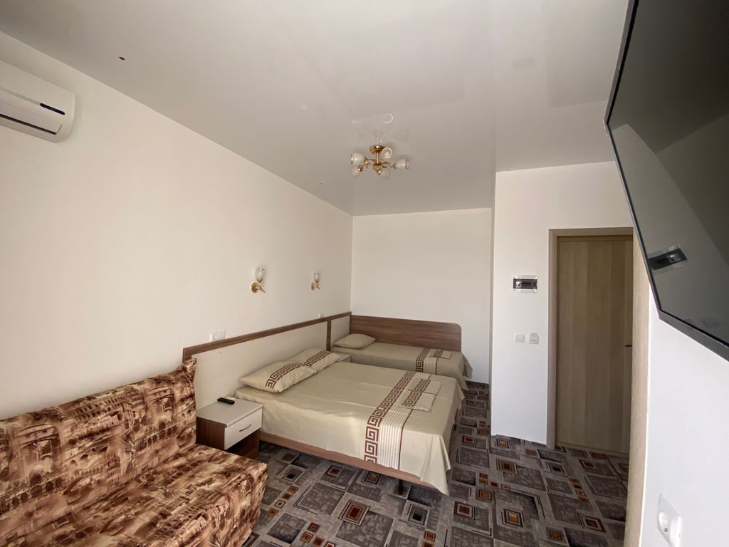 Уютный частный дом с четырьмя комнатами для отдыха семьи с детьми, семейной пары. До моря — 15 минут прогулочным шагом, с детьми или заходом в магазины чуть дольше. В каждой комнате — свой санузел, телевизор, холодильник, удобные кровати с постельным бельём и полотенцами, шкаф, балкон, кондиционер. У нас в доме в уличной обуви не ходят, поэтому не забудьте взять домашние тапочки. Также по дому можно ходить босиком или в носочках, как вам удобно. На каждом этаже кулер с горячей водой и комнатной температуры. Гладильная доска и утюг на втором этаже. Просторный двор, большой открытый подогреваемый бассейн для взрослых и бассейн для детей, детская игровая площадка, крытые беседки, отдельное место для курения. Вечером после 22:00 — тихое время, вечеринки запрещены. Общая оборудованная кухня, вся необходимая посуда для приготовления пищи. Парковка перед двором.