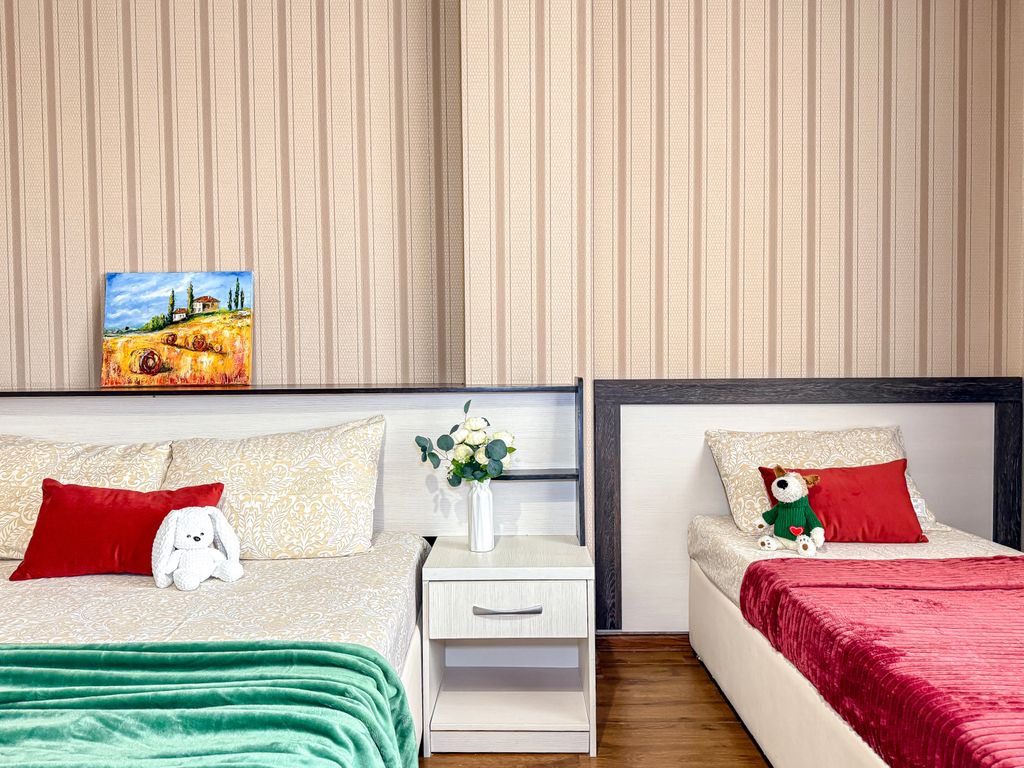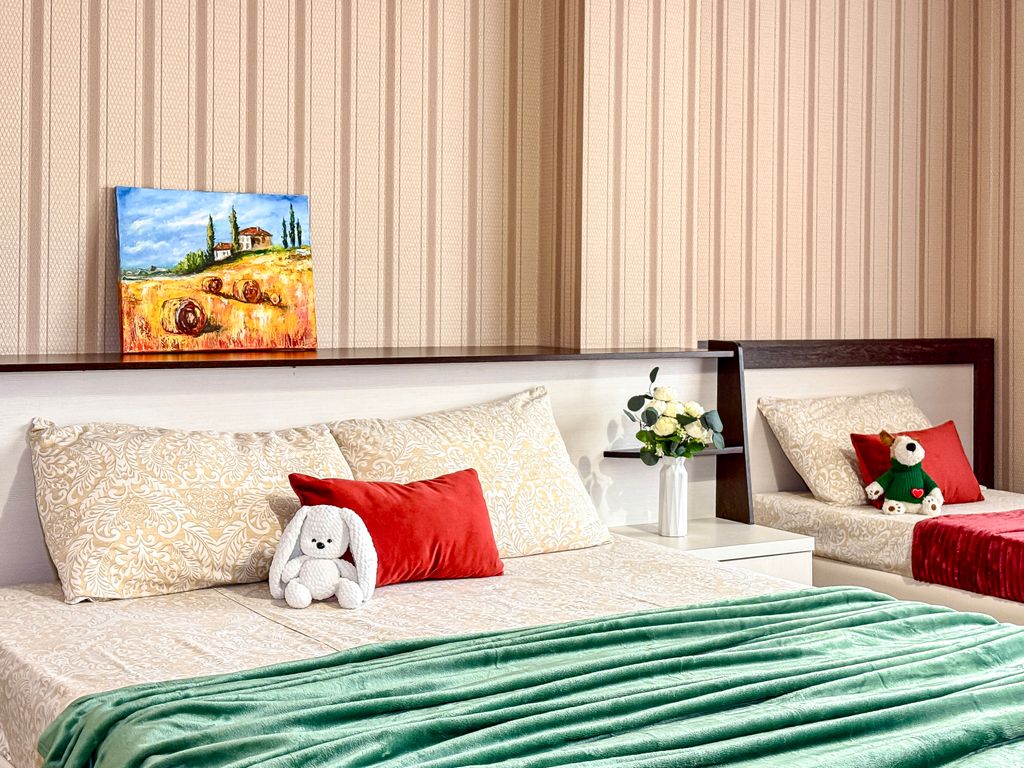Отель "Милана" Кабардинка, 7 минут до моря, ремонт 2025 года, новые матрасы Аскона, новый текстиль, просторные номера с балконами. Работает кафе на территории, цены ниже, чем на "берегу", комплексный завтрак 280, обед 580, ужин по меню. Рядом рынок, банкоматы, сетевые магазины.