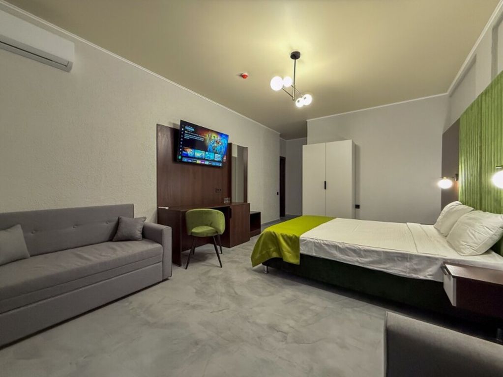 В номере: балкон, wi-fi интернет, душ, кондиционер, телевизор, холодильник, фен, тапочки, косметические принадлежности, зубные щётки с пастой, постельное бельё, полотенца, чайник, стаканы, приветственная вода. Уборка номера на 3 день, смена постельного белья и полотенец на 5 день. Гладильная доска с утюгом расположены на этаже. Кулер с питьевой водой на первом этаже. Вас ждут вкусные домашние завтраки и подогреваемый бассейн на крыше с видом на море. Платная парковка 800 м от гостевого дома.