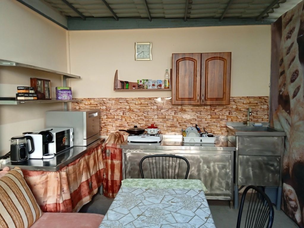 Всего на территории 5 номеров, 4 однокомнатных, один двухкомнатный. В каждом номере душ, туалет, тв. Одно и двухкомнатный номер трансформируются в трёхкомнатный с двумя санузлами, и можно разместить 6 -7 гостей. Один номер 25 кв м имеет отдельную кухню и террасу. Для других номеров отдельная кухня и столовая. Гостевой дом расположен в тихом, спокойном месте, на третьей линии. До моря 800 метров. В кухонных зонах имеются газовые плиты, микроволновки, холодильники, вся возможная посуда, электрочайники. В каждом номере wi -fi, имеются сплит системы, стиральные машины, утюги и прочее. Парковка на территории и перед домом. Есть площадка для детей на территории и большая лужайка перед домом. На территории растут хвойные деревья, виноград, цветы. Есть мангальная зона.