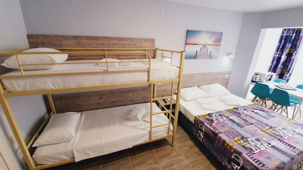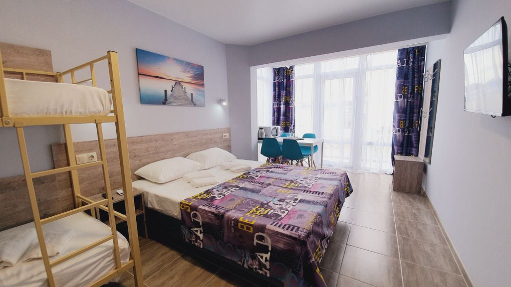 Мы находимся в джемете, 15 минут пешком до пляжа. До ближайшей столовой и продуктового магазина 5 минут пешком. Номера уютные и современные. Оснащение номеров: Ортопедические матрасы, Телевизор системы андроид, Мини холодильник с морозильной камерой, Кондиционер (охлаждение/обогрев); Чайник, кружки/стаканы, поднос, полотенце для посуды, Постельное белье-белое, хлопок, белые махровые полотенца, полотенце для ног, покрывала, одеяла; В сан/узле с душевой зоной- фен, жидкое мыло и туалетная бумага; В 4-х местных номерах микроволновая печь, На территории детская площадка, подогреваемый бассейн 5*10 м глубиной 1, 5 м с шезлонгами для загара, зона барбекю (решетки, шампура), зона для курения. Кухня-столовая для самостоятельного приготовления пищи с полным инвентарем, электроплитами- стеклокерамика, микроволновкой, холодильником с морозильной камерой. Уютная уличная терраса со столиками и креслами. Бесплатная автопарковка-под видеонаблюдением и освещением.