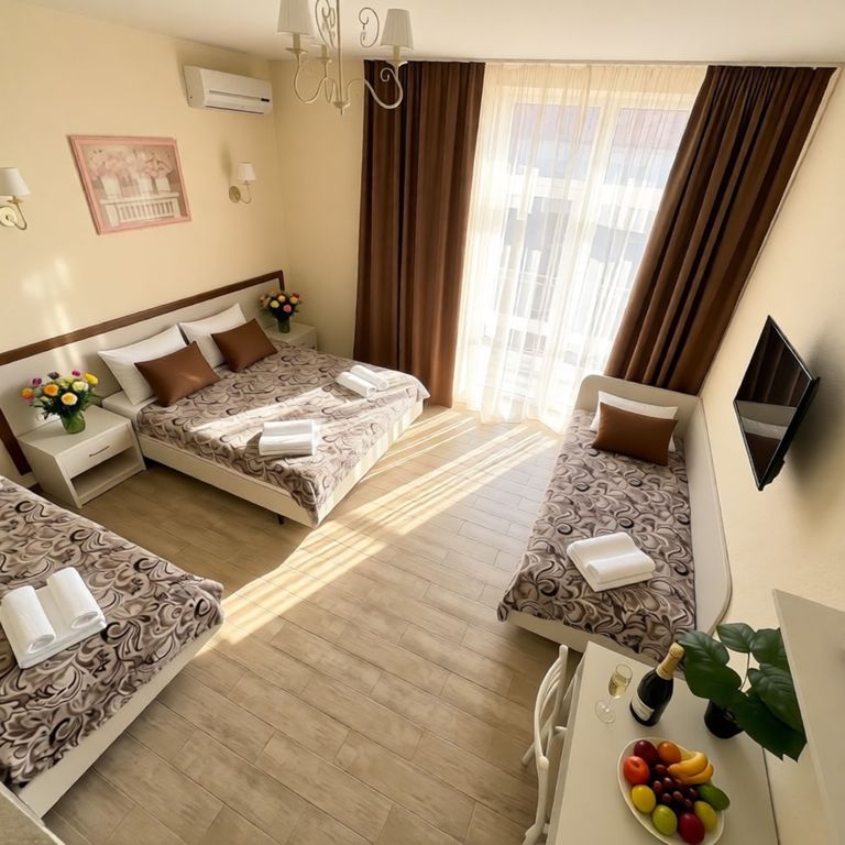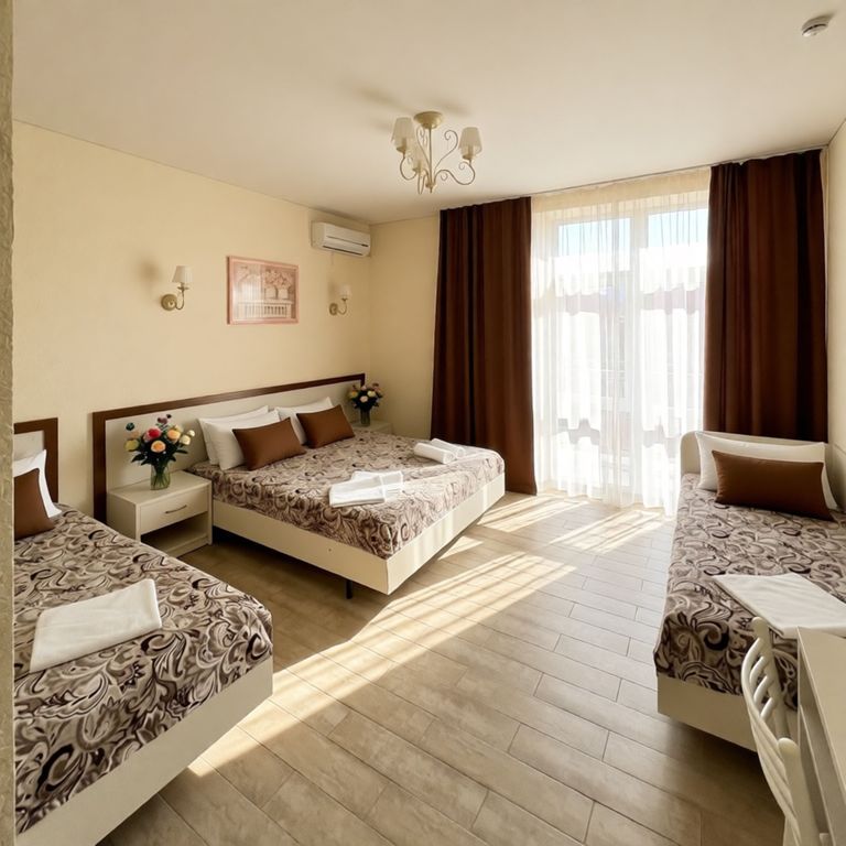 Гостевой дом «БАРВИХА» Расположен на первой береговой линии, до пляжа 250 м. Пляж оборудован навесами с шезлонгами для отдыха. На территории: Бар, столовая, бассейн для взрослых и детей, зона для загара, детская площадка на открытом воздухе, а также детская игровая комната в помещении. Все номера: повышенной комфортности для уютного проживания, различные категории вместимостью от 2х до 5 чел., от 1 ком-х до 2х ком-х. номеров с балконом, а также с собственной террасой. В номерах: Wi-Fi, кондиционер, телевизор, мини холодильник, фен, уличная мебель, тазик, швабра, по запросу детский горшок. Кроме того, мы предлагаем услуги прачечной, на каждом этаже имеется гладильная доска и утюг, а также микроволновая печь для вашего удобства. Идеально подойдут как для пар, так и для семей с детьми. Насладитесь тишиной, уютом и морским воздухом уже с первых дней отдыха! Любители водных процедур оценят взрослый и детский бассейн. Дл
