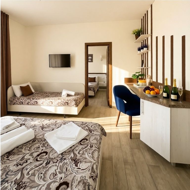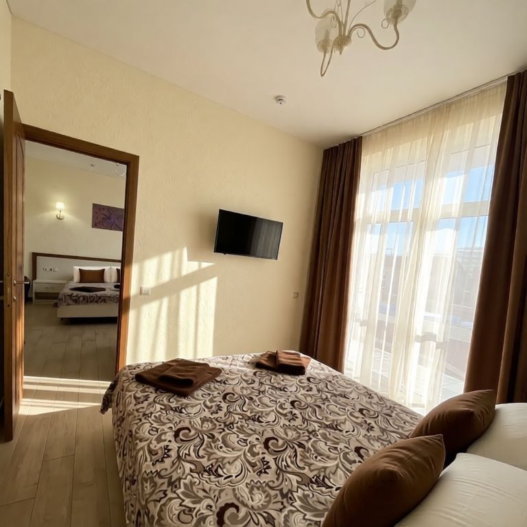 Гостевой дом «БАРВИХА» Расположен на первой береговой линии, до пляжа 250 м. Пляж оборудован навесами с шезлонгами для отдыха. На территории: Бар, столовая, бассейн для взрослых и детей, зона для загара, детская площадка на открытом воздухе, а также детская игровая комната в помещении. Все номера: повышенной комфортности для уютного проживания, различные категории вместимостью от 2х до 5 чел., от 1 ком-х до 2х ком-х. номеров с балконом, а также с собственной террасой. В номерах: Wi-Fi, кондиционер, телевизор, мини холодильник, фен, уличная мебель, тазик, швабра, по запросу детский горшок. Кроме того, мы предлагаем услуги прачечной, на каждом этаже имеется гладильная доска и утюг, а также микроволновая печь для вашего удобства. Идеально подойдут как для пар, так и для семей с детьми. Насладитесь тишиной, уютом и морским воздухом уже с первых дней отдыха! Любители водных процедур оценят взрослый и детский бассейн. Дл