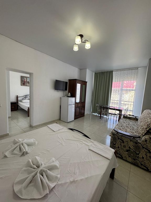 Дом находится в спокойном спальном районе, рядом вся необходимая инфраструктура! До моря 10−12 минут. В номерах установлены кондиционеры, поэтому в жаркую погоду находиться в них вполне комфортно. Уборка выполняется по графику, а также по запросу постояльцев. Для детей организована игровая площадка. Общая кухня для самостоятельного приготовления пищи располагается на первом этаже здания. Недалеко находится центр города с обилием сувенирных магазинов, рынок и дельфинарий.
