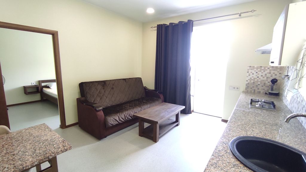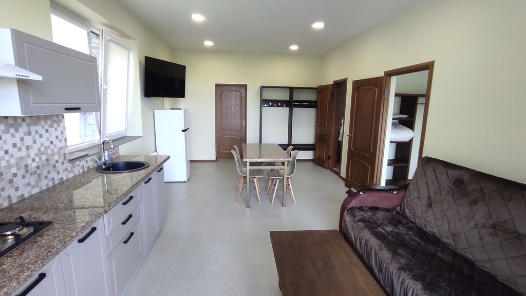 В частном 3-этажном домовладении с собственной парковкой и мангальной зоной сдаются меблированные квартиры площадью 50 м² каждая. С великолепным видом и обустроенным двором. Квартир несколько вариантов, для уточнения, какой вариант вам предпочтительнее, звоните. Для комфортного размещения в квартирах имеется всё необходимое: * кухонный гарнитур с газовой плитой и каменной столешницей; * обеденный стол с каменной столешницей; * журнальный столик с березовой столешницей; * двуспальная берёзовая кровать, изготовленная по специальному заказу с ортопедическим матрасом; * диван; * два телевизора: один в гостиной, один в спальной комнатах; * качественное постельное бельё и махровые полотенца; * вся необходимая бытовая техника (микроволновая печь, стиральная машинка, холодильник, электрический чайник, фен), посуда и столовые приборы; * гладильная доска; * сушилка для вещей; * утюг; * фен; * безлимитный Wi-Fi; * мангальная зона; * в доме автономное водоснабжение и отопление; * в