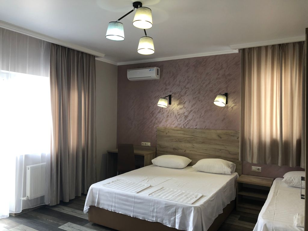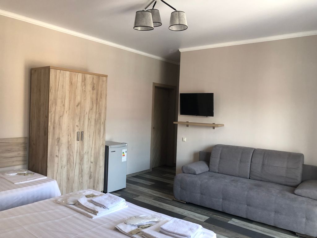 Гостевой дом располагает небольшим номерным фондом различной модификации. От двухместного до двухкомнатного номера для 8 человек. Некоторые номера со своей кухней. Уютные номера оснащены всем необходимым для комфортного пребывания. В каждом номере: кондиционер, телевизор, холодильник. Фен предоставляем по запросу. На территории расположен просторный бассейн с подогревом, с выделенной зоной для малышей. В бассейне разноуровневая глубина, это позволяет свободно плавать как детям, так и взрослым. Режим работы бассейна с 8.00 до 22.00 К услугам маленьких гостей есть детская площадка и турник для взрослых. К услугам взрослых мы бесплатно предоставляем в пользование мангальную зону. Рядом с бассейном работает кафе-бар с большим выбором напитков и закусок. По запросу готовим домашние завтраки и обеды. Здесь же можно осуществлять прием собственной еды, для ее подогрева здесь стоит микроволновка и термопот для общего пользования. Для путешествующих на автомобиле, мы готовы предоставить парковк