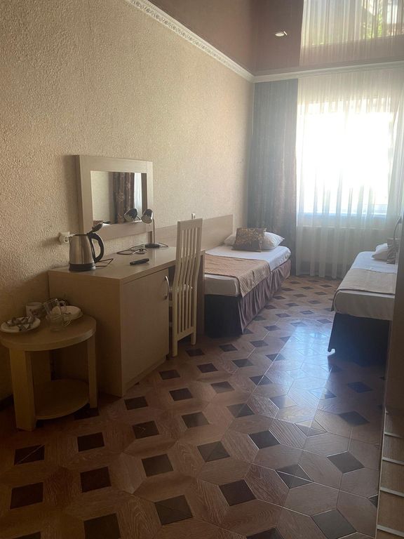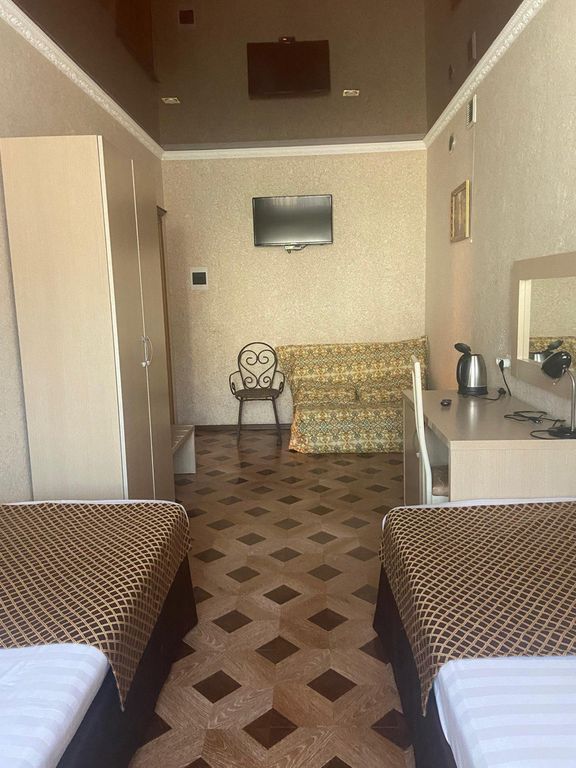 В нашем гостевом доме 10 номеров, номера рассчитаны от 1 до 5 человек, все оборудованы кондиционерами, холодильниками, ТВ, электрочайниками, полотенцами (не пляжными), постельным бельём, для общего пользования есть зона для приготовления пищи (плита газовая), СВЧ, гладильная доска с утюгом, стиральная машинка (300 рублей), мангальная зона, парковка на три машины. В номерах не курят! Шумные компании — это не к нам! Обязательно соблюдаем время тишины с 23:00! Уборка в номерах осуществляется на 6-е сутки со сменой постельного и полотенец, на третьи сутки — влажная уборка номера. В шаговой доступности супермаркеты, кафе, столовые, аптеки. До моря 20−25 минут пешком. Для вашего комфорта есть бесплатный трансфер с общественной остановки до канатки («Олимп»), («Сафари-парк»), аквапарка — «Золотая бухта». Красивые набережные, океанариум, парк аттракционов, аквапарк «Дельфин», остановки общественного транспорта. Также для любителей экскурсий у нас есть возможность заранее вам предоставить ин