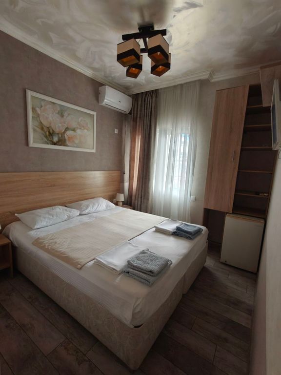 От моря около 70 м, на первом этаже столовая(очень вкусно готовят), на втором этаже общая кухня оборудованная всем необходимым ( плита,микроволновая печь,эл. чайник,кастрюли, сковорода,ложки,вилки, посуда,столы,стулья), комнаты от 2-х до 4-х местные(ещё можно доп. место), есть 2-х комнатные квартиры люкс(кухня и санузел внутри),есть комнаты с балконами. В комнатах кондиционер,телевизор, тумбочки, светильники, холодильник, шкаф для одежды,санузел(шампунь,мыло,зубная паста с щёткой).
