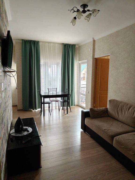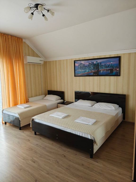 От моря около 70 м, на первом этаже столовая(очень вкусно готовят), на втором этаже общая кухня оборудованная всем необходимым ( плита,микроволновая печь,эл. чайник,кастрюли, сковорода,ложки,вилки, посуда,столы,стулья), комнаты от 2-х до 4-х местные(ещё можно доп. место), есть 2-х комнатные квартиры люкс(кухня и санузел внутри),есть комнаты с балконами. В комнатах кондиционер,телевизор, тумбочки, светильники, холодильник, шкаф для одежды,санузел(шампунь,мыло,зубная паста с щёткой).