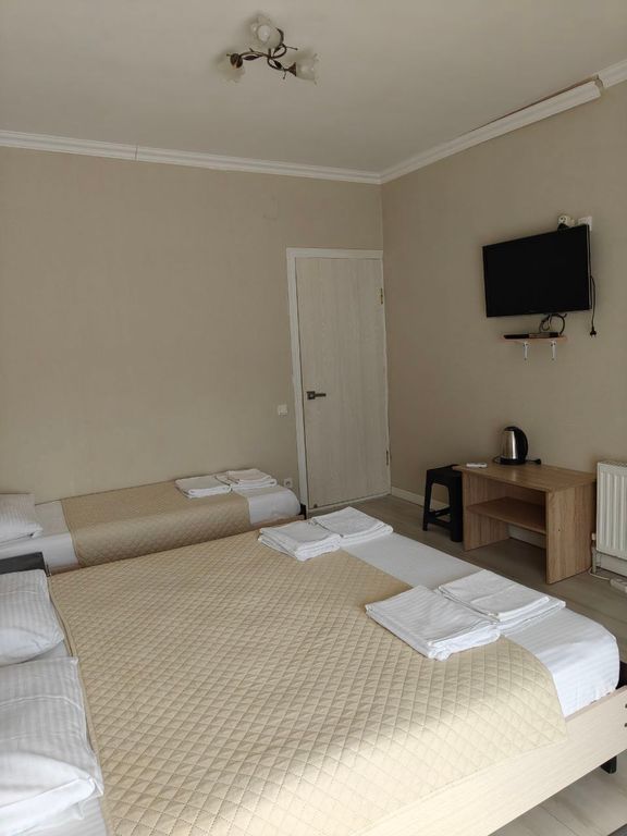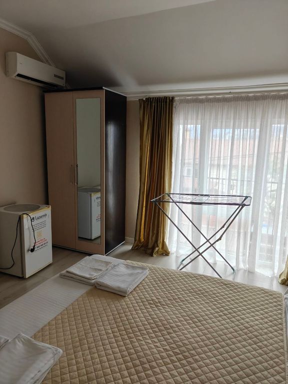 От моря около 70 м, на первом этаже столовая(очень вкусно готовят), на втором этаже общая кухня оборудованная всем необходимым ( плита,микроволновая печь,эл. чайник,кастрюли, сковорода,ложки,вилки, посуда,столы,стулья), комнаты от 2-х до 4-х местные(ещё можно доп. место), есть 2-х комнатные квартиры люкс(кухня и санузел внутри),есть комнаты с балконами. В комнатах кондиционер,телевизор, тумбочки, светильники, холодильник, шкаф для одежды,санузел(шампунь,мыло,зубная паста с щёткой).