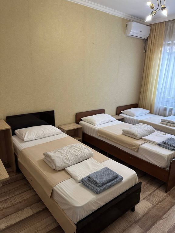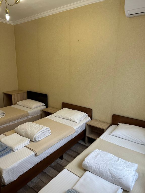 От моря около 70 м, на первом этаже столовая(очень вкусно готовят), на втором этаже общая кухня оборудованная всем необходимым ( плита,микроволновая печь,эл. чайник,кастрюли, сковорода,ложки,вилки, посуда,столы,стулья), комнаты от 2-х до 4-х местные(ещё можно доп. место), есть 2-х комнатные квартиры люкс(кухня и санузел внутри),есть комнаты с балконами. В комнатах кондиционер,телевизор, тумбочки, светильники, холодильник, шкаф для одежды,санузел(шампунь,мыло,зубная паста с щёткой).