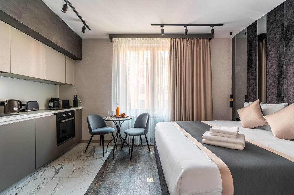Дизайнерские апартаменты с гостиничным сервисом в центре Санкт-Петербурга. Расположены в новом здании на тихой улице в 5 минутах ходьбы от Невского проспекта и Московского вокзала. Сервисные апартаменты оборудованы полноценной кухней с современной техникой и полной комплектацией посуды и столовых приборов. Ежедневная уборка входит в стоимость проживания. Вся необходимая косметика, средства для стирки белья и посуды также предоставляются бесплатно.