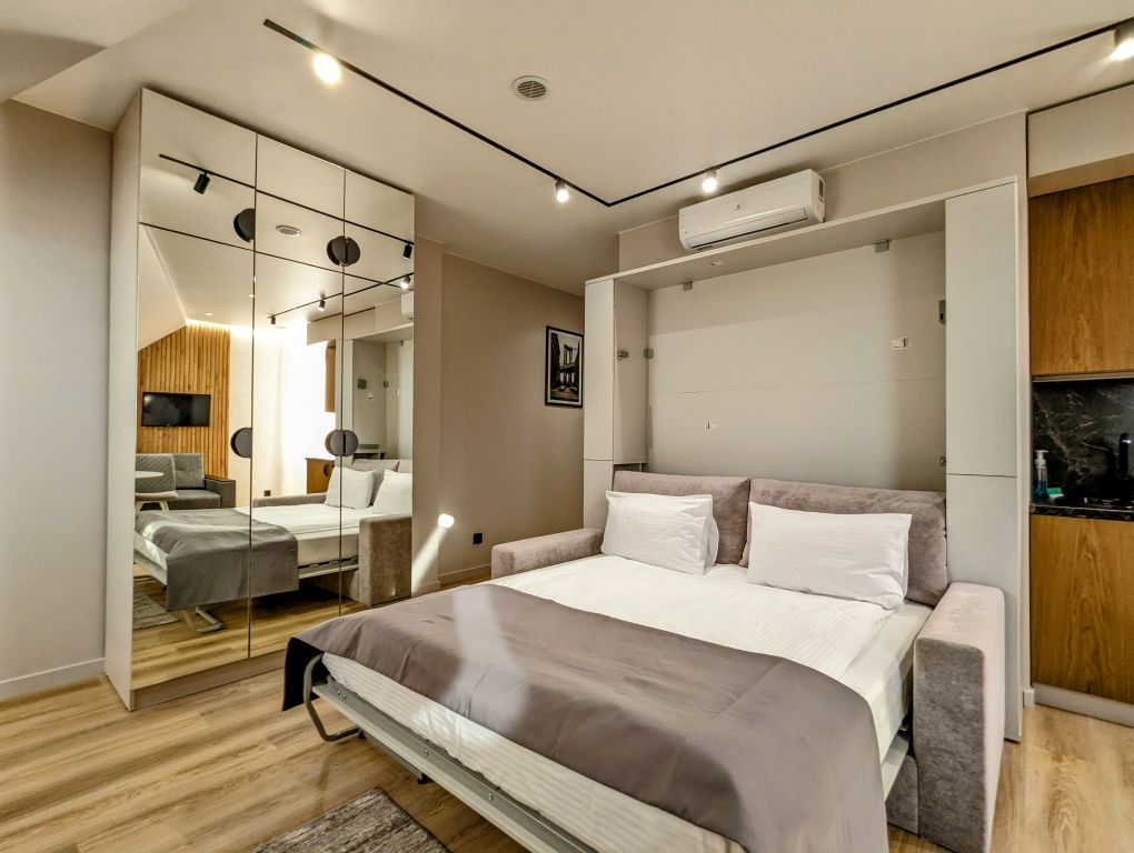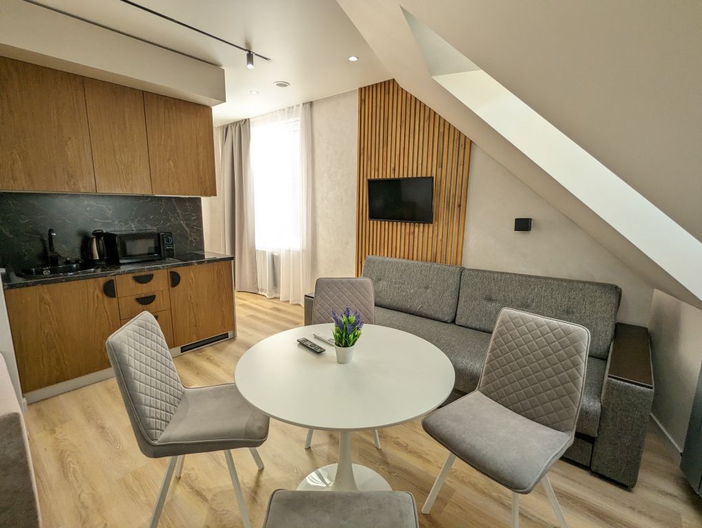 Современный Апарт-отель, с уровнем обслуживания и сервиса уровня трех звезд. Расположен в центре города Сочи. Ближайший пляж в пяти минутах ходьбы. Каждый номер оформлен по-персональному дизайн-проекту в стиле европейской классики. Полная комплектация современной мебелью и бытовой техникой для комфортного проживания на протяжении всего срока. Оборудованная кухня и обеденная зоны, позволяющие следить за своим рационом без привязки к меню и режиму работы местных кафе и ресторанов.