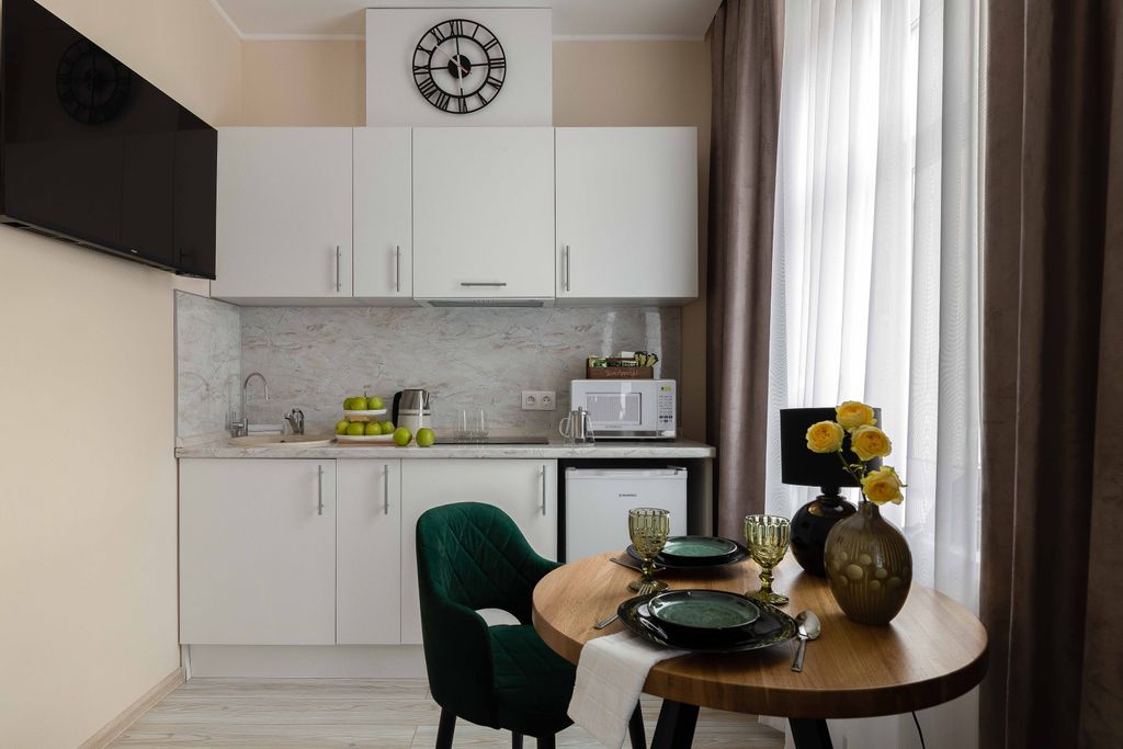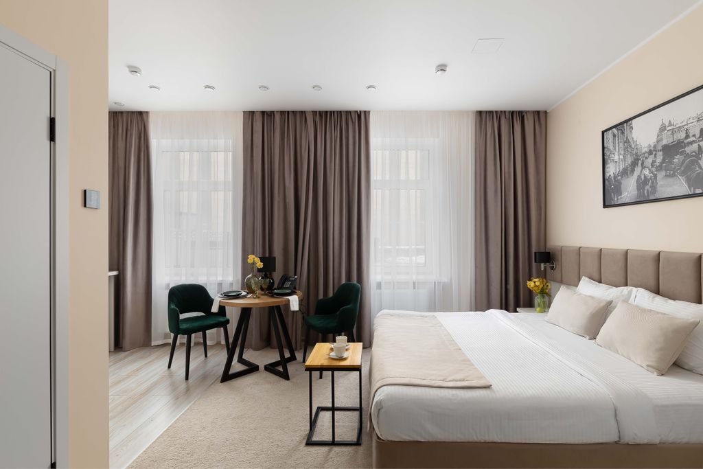 Представляем вашему вниманию новый современный 4х звездочный апарт - отель Greenstone. Отель расположен в центральном административном округе, в его историческом культурном и деловом центре, который прекрасно сочетает в себе деловую активность, сферу развлечений и спокойную размеренную жизнь. Отель находится в 620 метрах от м. Проспект мира. Отель включает в себя 22 двухместных номера повышенной категории. Все комнаты апарт-отеля оформлены в современном стиле и наполнены самым необходимым для длительного и комфортного проживания: Каждый номер оборудован: - кухонным гарнитуром с встраиваемой новой техникой: (варочная панель, вытяжка, микроволновая печь) чайник, посуда. - индивидуальной системой кондиционирования - мини сейфом, интерактивным телевидением - кровать двух спальная - связью для вызова персонала