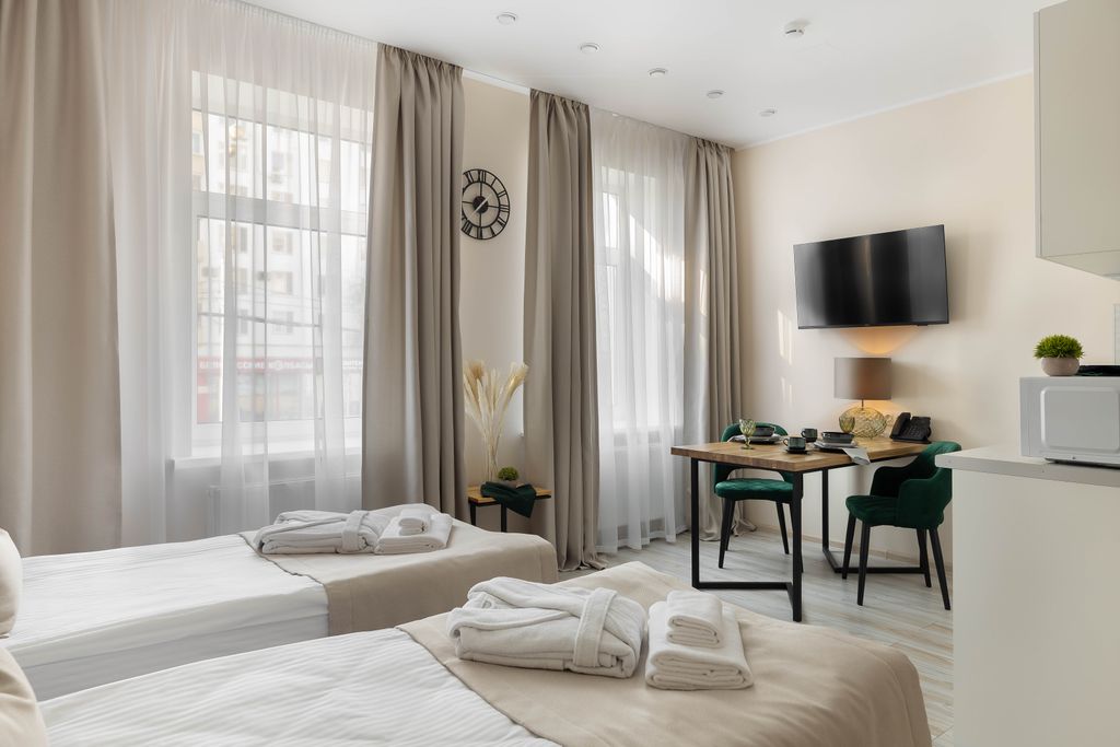 Представляем вашему вниманию новый современный 4х звездочный апарт - отель Greenstone. Отель расположен в центральном административном округе, в его историческом культурном и деловом центре, который прекрасно сочетает в себе деловую активность, сферу развлечений и спокойную размеренную жизнь. Отель находится в 620 метрах от м. Проспект мира. Отель включает в себя 22 двухместных номера повышенной категории. Все комнаты апарт-отеля оформлены в современном стиле и наполнены самым необходимым для длительного и комфортного проживания: Каждый номер оборудован: - кухонным гарнитуром с встраиваемой новой техникой: (варочная панель, вытяжка, микроволновая печь) чайник, посуда. - индивидуальной системой кондиционирования - мини сейфом, интерактивным телевидением - кровать двух спальная - связью для вызова персонала