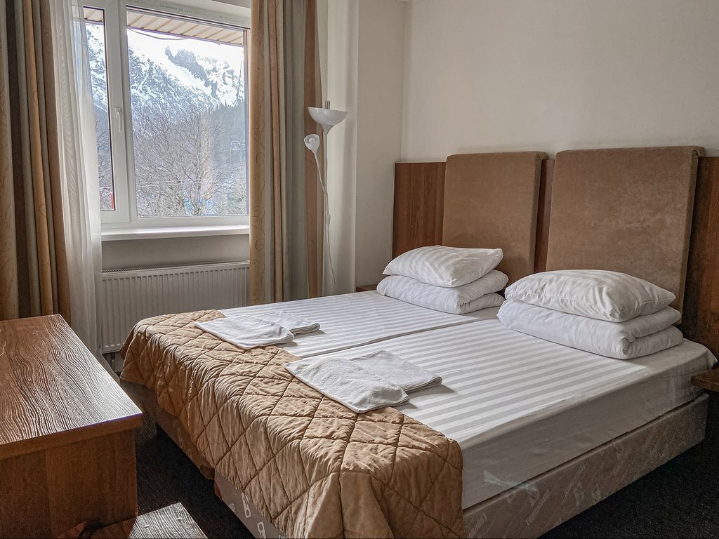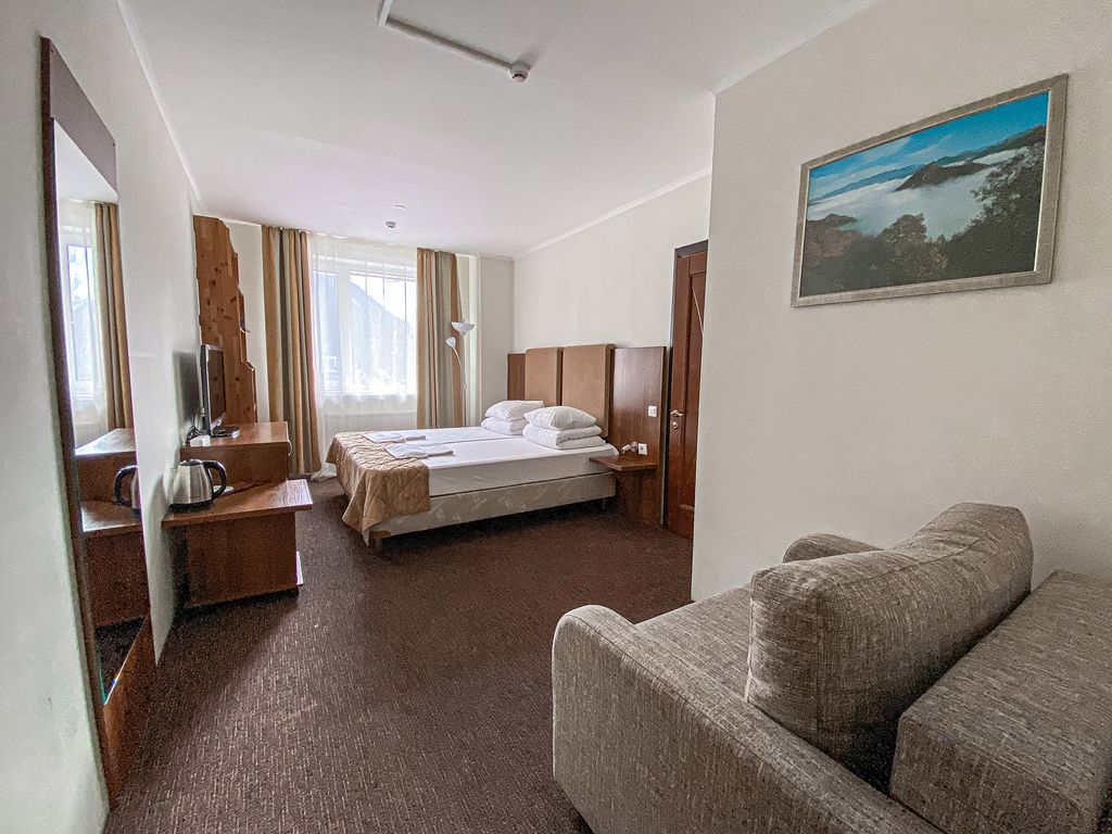 В горах всё по-другому: воздух чище, небо голубее, вода прозрачней, эмоции ярче, а привычные заботы остаются далёко-далеко внизу. Отдохнуть в горном отеле подальше от городской суеты — то, что нужно для восстановления сил, энергии и здоровья. В горах два сезона: зимняя сказка— для любителей морозного воздуха, горных лыж и сноуборда — и летние пейзажи — для всех, кто мечтает о спокойном отдыхе на природе, или походах в горы за яркими впечатлениями. Впервые свои двери для гостей мы открыли в январе 2012 года. Нашу визитную карточку: русское гостеприимство и высокий сервис обслуживания уже оценили наши гости. В двух корпусах нашего отеля расположены номера различного уровня комфорта: эконом, стандарт, комфорт, люкс с балконом, семейный полулюкс и апартаменты. Просторные номера оборудованы всем необходимым для комфортного проживания. Каждый сможет подобрать тип размещения согласно своим предпочтениям. Вокруг отеля на территории растут вековые деревья, протекает горный ручей, который ве