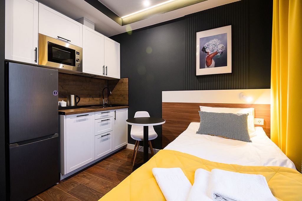 Представляем вашему вниманию новые апартаменты на Краснопутиловской 111. Благоприятные условия проживания помогут вам насладиться пребыванием в Санкт-Петербурге, а из просторных номеров Люкс открывается панорамный вид города. Апартаменты расположенные на пятом этаже многофункционального жилого комплекса, снабжены эффективной вентиляцией, кондиционерами, а также системой «тёплый пол». В здании находится Fitness House, магазин «Магнит» , кафе «Кулинария». Вы, несомненно, оцените дизайнерскую мебель, качественные материалы отделки, зеркало с подсветкой в ванной комнате и кровати с ортопедическими матрасами. Обязательно сообщите нам, какой тип кроватей Вам предпочтителен — раздельные или большая двуспальная. К Вашим услугам круглосуточная стойка регистрации. Каждый номер укомплектован необходимым для проживания и работы как на короткий, так и на длительный срок. Собственная кухня оснащена необходимой техникой: микроволновой печью, электрическим чайником, плитой, холодильником, посудомое
