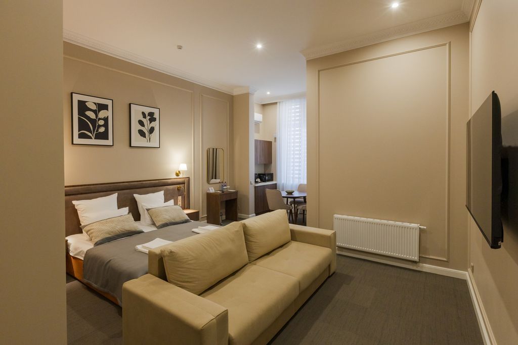 Жильё на улице Максима Горького предоставляет возможность комфортного проживания с питомцами за дополнительную плату. В номерах есть всё необходимое: кондиционеры, холодильники, сейфы, чайники и большие телевизоры. Бесплатный Wi-Fi, звукоизоляция, а также чай, кофе и тапочки создают дополнительное удобство для гостей. К услугам постояльцев также предоставляются посуда, микроволновая печь, кофеварка, фен, полотенца, мыло и шампунь. Для комфорта гостей осуществляется ежедневная уборка. Кроме того, в здании есть бесплатная парковка и камера хранения. По запросу организуется трансфер до аэропорта и железнодорожного вокзала. По утрам подают континентальный завтрак прямо в номер. Рядом находятся различные кафе и рестораны, среди которых «ГурманиЯ» с паназиатской кухней, «Сакля» с восточной кухней, «Рокфор» с фастфудом, а также Park Terrace с кавказской кухней и «Семейное» с молочными коктейлями. Для отдыха и развлечений можно посетить парк Ак-Гёль с аттракционами и памятником Русской учитель