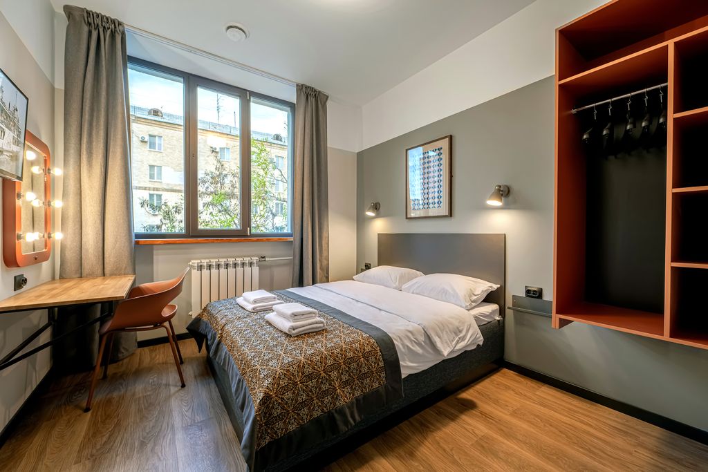 Отель и хостел "Друзья Волгоград" находится в центре Волгограда, и всего за 5 минут ходьбы отсюда можно оказаться на берегу волги. Гостиница занимает четырёхэтажное здание. На первом этаже, помимо стойки ресепшен, расположена просторная гостиная и три комфортных номера с удобствами (душевая, туалет и раковина). Второй и третий этажи занимают отдельные и многоместные номера, рядом с ними находятся полностью оборудованные кухни, а также душевые кабинки и туалеты общего пользования. Четвёртый этаж отведён под номера студии с ванными комнатами. Оформление отеля создавалось под влиянием лучших образцов дизайна советской эпохой. Во внутреннем оформлении номеров угадываются нотки конструктивизма, а стены украшают постеры с орнаментами в стиле 20-х годов. Отдельные номера с удобствами оборудованы мини-кухнями со всем необходимым для приготовления пищи. В некоторых комнатах есть дополнительное спальное место — раскладной диван. Многоместные восьми- и десятиместные номера оборудован
