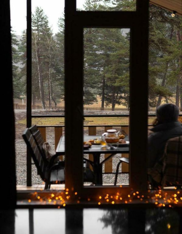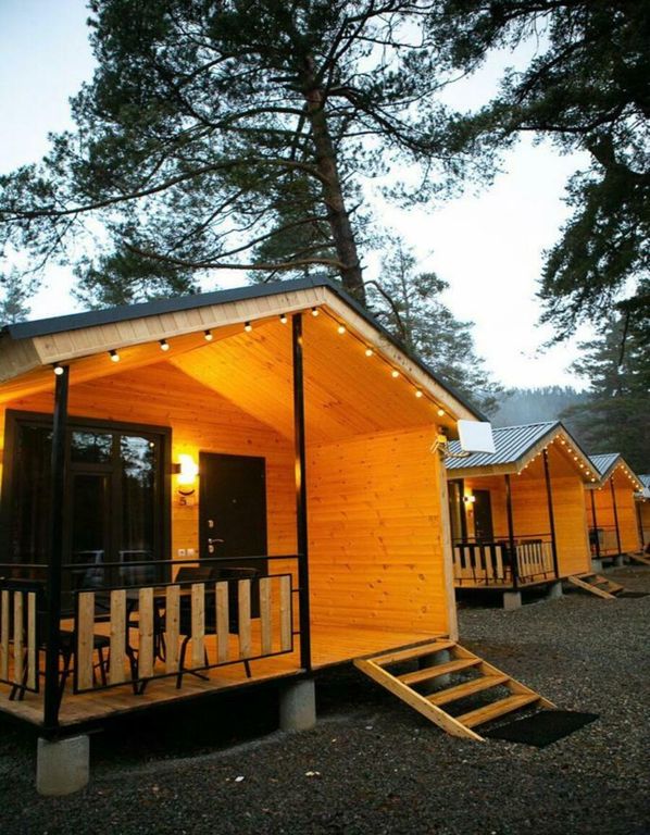 Отдых в Архызе. Домики в лесу на Софийской поляне с видом на горы.