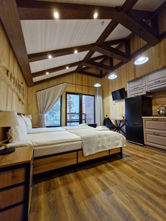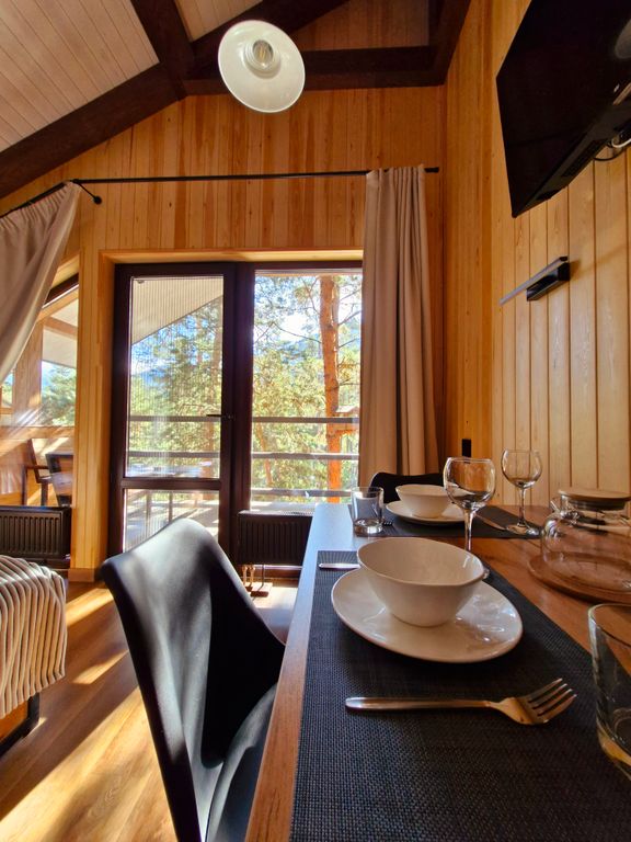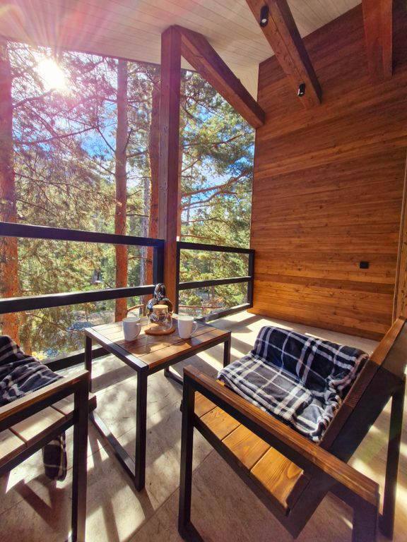 База отдыха Les Apart - это 2х-местные и Семейные (на 5-7 человек) апартаменты с кухней и собственной террасой, панорамными окнами, с видом на лес и горы. Расположен в 200 метрах (3 минуты ходьбы) от центральной улицы Архыза, где Вы оказываетесь в тихом сосновом лесу вблизи от горной реки. В 5-10 минутах ходьбы доступны кафе, рестораны, магазины, аптека, прокат. от Архыза до канатных дорог - 10 км. Домашняя уютная атмосфера номеров позволит Вам почувствовать себя в тишине гор, как на своей даче, вдали от суеты. У нас тихая тупиковая улица. Все номера имеют отдельный вход с улицы, благоустроены собственной кухней (плита, холодильник, микроволновая печь, посуда, инвентарь), а также: телевизор, фен, утюг (или отпариватель для одежды), сушка для обуви и оборудования, стиральная машинка и пылесос (в Семейных номерах). На террасах возле дома мангалы (шампуры предоставляются), мебель для отдыха. Наличие своей котельной позволяет гостям пользоваться горячей водой без ограничений. Зимой в до