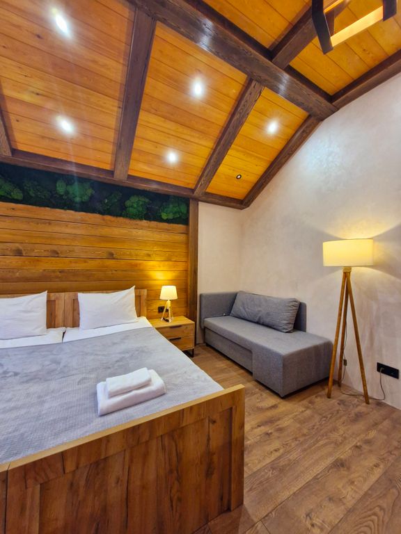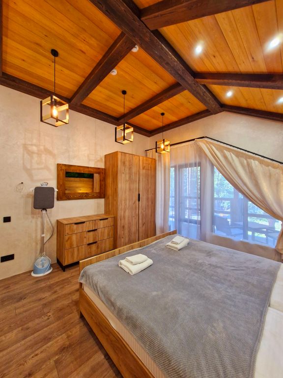 База отдыха Les Apart - это 2х-местные и Семейные (на 5-7 человек) апартаменты с кухней и собственной террасой, панорамными окнами, с видом на лес и горы. Расположен в 200 метрах (3 минуты ходьбы) от центральной улицы Архыза, где Вы оказываетесь в тихом сосновом лесу вблизи от горной реки. В 5-10 минутах ходьбы доступны кафе, рестораны, магазины, аптека, прокат. от Архыза до канатных дорог - 10 км. Домашняя уютная атмосфера номеров позволит Вам почувствовать себя в тишине гор, как на своей даче, вдали от суеты. У нас тихая тупиковая улица. Все номера имеют отдельный вход с улицы, благоустроены собственной кухней (плита, холодильник, микроволновая печь, посуда, инвентарь), а также: телевизор, фен, утюг (или отпариватель для одежды), сушка для обуви и оборудования, стиральная машинка и пылесос (в Семейных номерах). На террасах возле дома мангалы (шампуры предоставляются), мебель для отдыха. Наличие своей котельной позволяет гостям пользоваться горячей водой без ограничений. Зимой в до