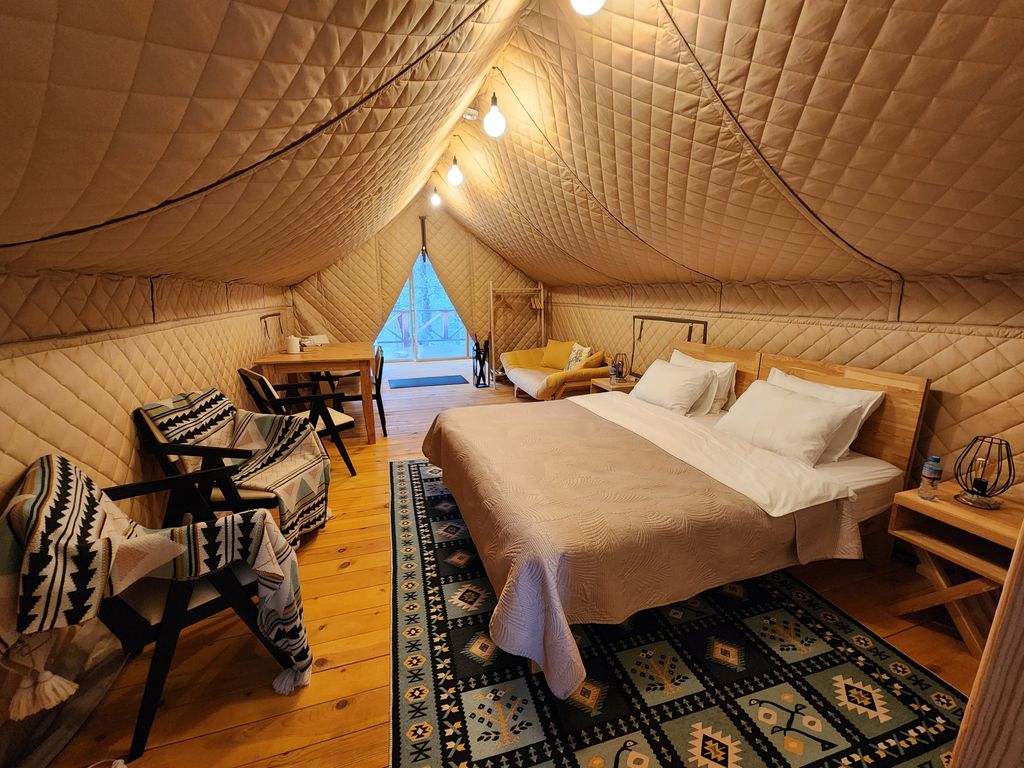Бутик-отель и глэмпинг Вдохни Алтай находится в живописном уединённом месте в 5 минутах езды от села Узнезя на берегу горной реки. На нашей территории расположены глэмпинг (3 сафари-тента) и здание отеля (пока в ней только одни апартаменты). Сафари-тенты - это не просто "палатки", это полноценный гостиничный номер в необычном формате. В каждом тенте есть полноценная кухня и санузел как в хорошем отеле. Сафари-тенты обогреваются тёплыми полами и батареями отопления - вы точно не замёрзнете прохладными алтайскими ночами. Но на всякий случай мы также позаботились о дополнительных обогревателях. В апартаментах также есть всё необходимое для полноценного отдыха: оборудованная кухня с посудомоечной машиной и большим холодильником, собственный санузел с душевой кабиной и стиральной машиной, тёплые полы, отопление, скважинная питьевая вода, два больших телевизора со smart-tv. Если вы захотите заказать завтрак, обед или ужин - просто обратитесь к администратору. Меню есть в каждом