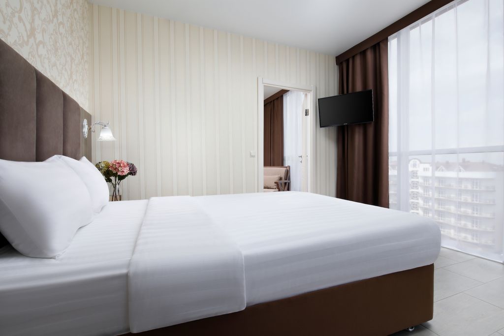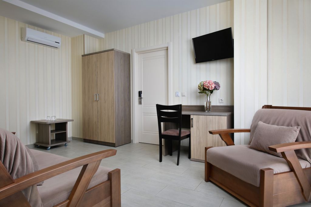 Одно из главных достоинств отеля — близость к морю. Всего в 600 метрах от отеля вас встретят несколько километров замечательного чистого песчаного пляжа. И можете быть абсолютно уверены, что без проблем найдете себе здесь место под солнцем. Общая протяженность пляжей в Витязево более 15 километров, ширина от 80 до 200 метров, а золотые пески обладают целебными свойствами благодаря высокой концентрации полевых шпатов и кварца. Очень плавное увеличение глубины моря идеально подойдет для отдыха с совсем маленькими детьми или подростками, которые пока не уверенно чувствуют себя в водной стихии. А если вдруг вам не захочется идти на море, то на территории пансионата вас ждут два уютных бассейна (один из которых подогреваемый), с отдельными детскими зонами, гидромассажем и гейзерами. Теперь полежать на шезлонге с ароматным коктейлем можно и особо не удаляясь от своего номера. А красочная подсветка бассейнов в вечернее время создаст умиротворяющую или даже романтическую обстановку, которая п