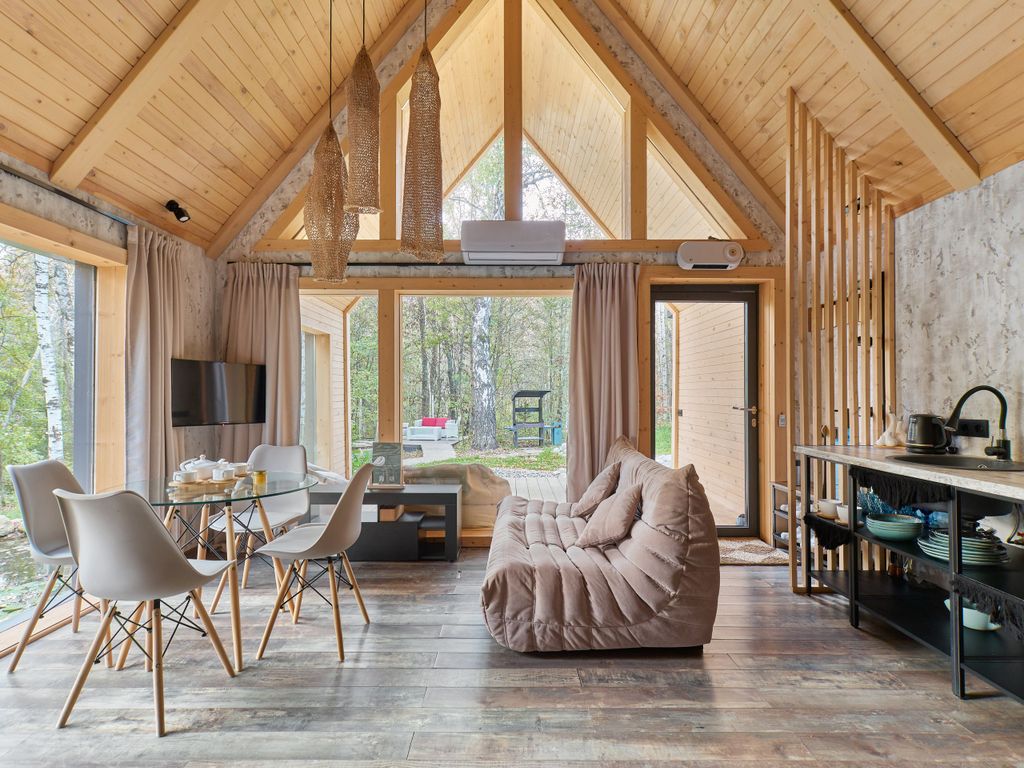 Эко-усадьба «Тишина» расположена в посёлке Озёрный, Высокогорского района Республики Татарстан. Это место идеально подходит для отдыха на природе, предлагая комфортное размещение в уютных домиках, окружённых лесами и озёрами. Размещение: Барн-хаус «Я скучаю 1» и «Я скучаю 2»: Уединённые домики площадью 60 м², рассчитанные на 4 гостей. Каждый оснащён собственной сауной и чаном у пруда, что создаёт идеальные условия для романтического отдыха. Дом с баней у озера: Просторный дом площадью 80 м², вмещающий до 12 гостей. Идеален для семейных поездок или отдыха с друзьями. Большой дом: Площадью 300 м², рассчитанный на приём до 30 гостей за банкетным столом и предоставляющий 10 спальных мест. Подходит для проведения мероприятий и торжеств. Дом «Пасечника»: Уютный домик площадью 60 м², рассчитанный на 6 гостей. Отличный выбор для семейного отдыха или небольших компаний. Гости могут насладиться настоящей русской баней на дровах, а также расслабиться в чанах с подогревом, расположенных у пруда. П