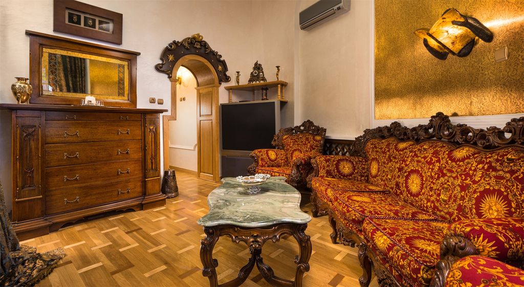 Блеск и отчаянное желание наслаждаться жизнью, интерьеры в духе фильма "Великий Гэтсби" изысканность и общее ощущение праздника - все это Art Deco. Отделка и меблировка некоторых апартаментов, превышает 10 000 000 руб. В 2021 произведен ремонт и заменена мебель. Все апартаменты выдержаны в индивидуальном классическом стиле с использованием благородных пород дерева (дуб, красное дерево, карельская береза,) мрамора и гранита. В оформлении апартаментов использована мебель и аксессуары, в стиле Art Deco,- Maitland Smith,Theodore Alexander, также здесь представлена коллекция антикварной мебели и аксессуаров, которые предают нотки средневекового романтизма. Убранство апартаментов дополняется роскошными люстрами, торшерами и бра фирмы Swarovski, которые сочетаются с гипсовой лепниной и высотой потолка достигающей четырех метров. Межкомнатные двери изготовлены из ясеня , полы паркет, из дуба и красного дерева. Матрасы с эффектом памяти, в качестве наполнителя отличаются повышенным ур