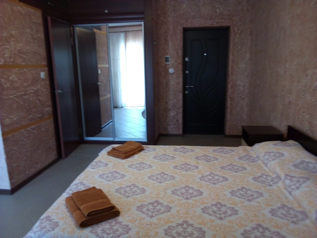 В гостевом доме 2 номера площадью 25 кв. м каждый. В каждом номере санузел, душ. Обеденная зона, холодильник, телевизор, кондиционер двухспальная кровать. На первом этаже находится кухня, оборудованная всем необходимым: газовая плита, двухкамерный холодильник, СВЧ печь, посуда. Есть возможность организации дополнительного спального места для ребенка за доп. плату.