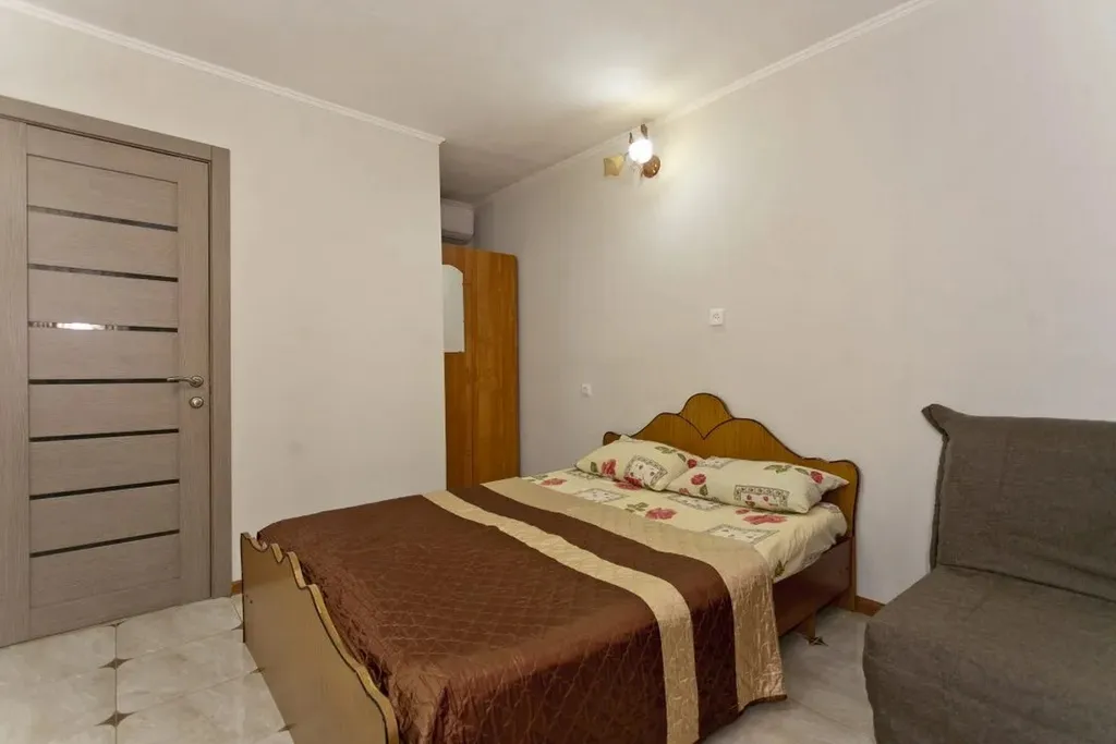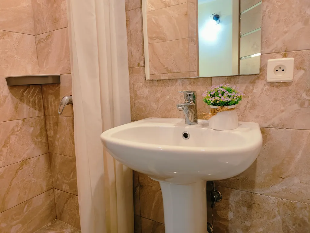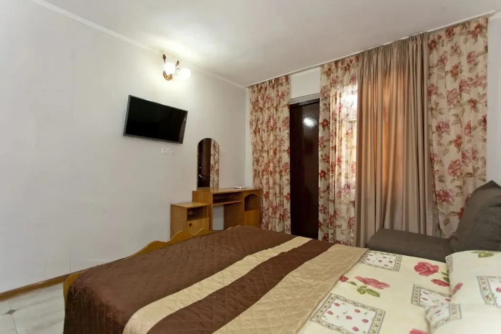 2 х спальная кровать 1,40 м, кровать 80 см, ТВ, кондиционер, холодильник, шкаф, зеркало, прикроватная тумбочка, ванна, унитаз, раковина, туалетные принадлежности.