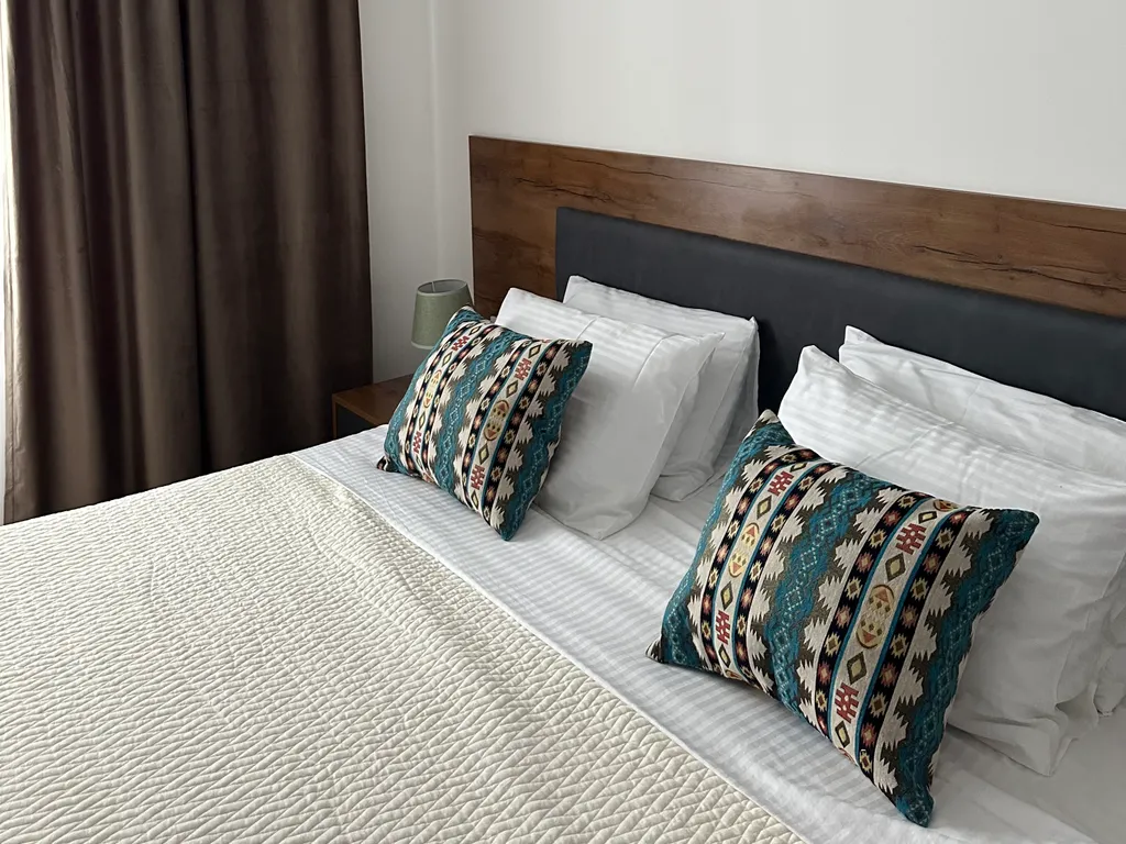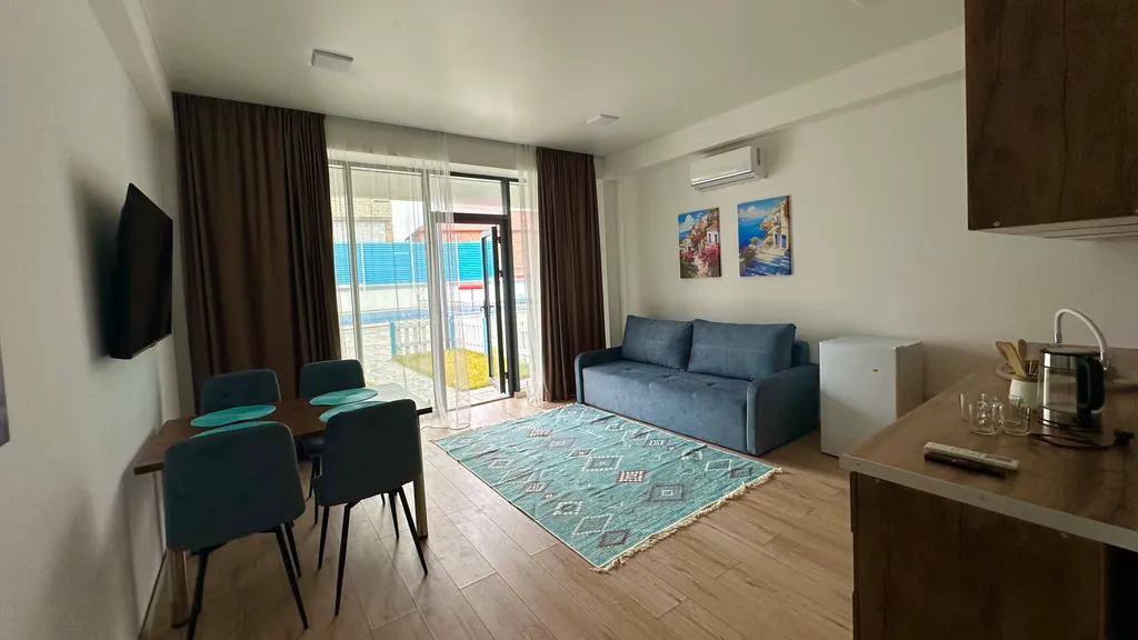Каждый номер имеет отдельную террасу с выходом к бассейну. Открытая терраса с собственным двориком располагает шезлонгами и зоной отдыха с плетёной мебелью. Вместительные двухкомнатные апартаменты идеально подходят для вашего семейного отдыха. В каждом номере есть уютная спальня, гостиная с диваном и кухня. В апартаментах есть всё для комфортного и длительного пребывания: чайник, утюг, холодильник, smart tv, кондиционеры в каждой комнате, посуда.