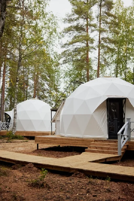 Купольный дом в форме сферы - идеальная форма отдыха. В этом доме нет ни одного острого угла: энергия свободно циркулирует во внутреннем пространстве. Воплощенная гармония с окружающим миром! Планировка включает спальню, мини-кухню, комфортную душевую кабинку, санузел с горячей водой. В доме есть все необходимое для проживания от 2 суток. Предоставляются гигиенические принадлежности (зубной набор, гель для душа, шампунь), полотенца. Комплектация дома: - 2 дополнительных спальных места на 2-м полуэтаже - Двуспальная кровать на 1-м этаже - Зона кухни, - Посуда, - Мини-холодильник - Кондиционер - Теплый пол - Душевая кабина - Санузел - Фен - Отдельная терраса - Мангал Вместимость: до 2-х человек Дети до 3-х лет бесплатно без предоставления дополнительного спального места. Дети с 4х лет размещаются на дополнительном месте, стоимость под запрос. Возможно размещение с животными, только собаки до 5 кг и 30 см в холке при наличии вет. паспорта. Стоимость 1000 руб. /сут.