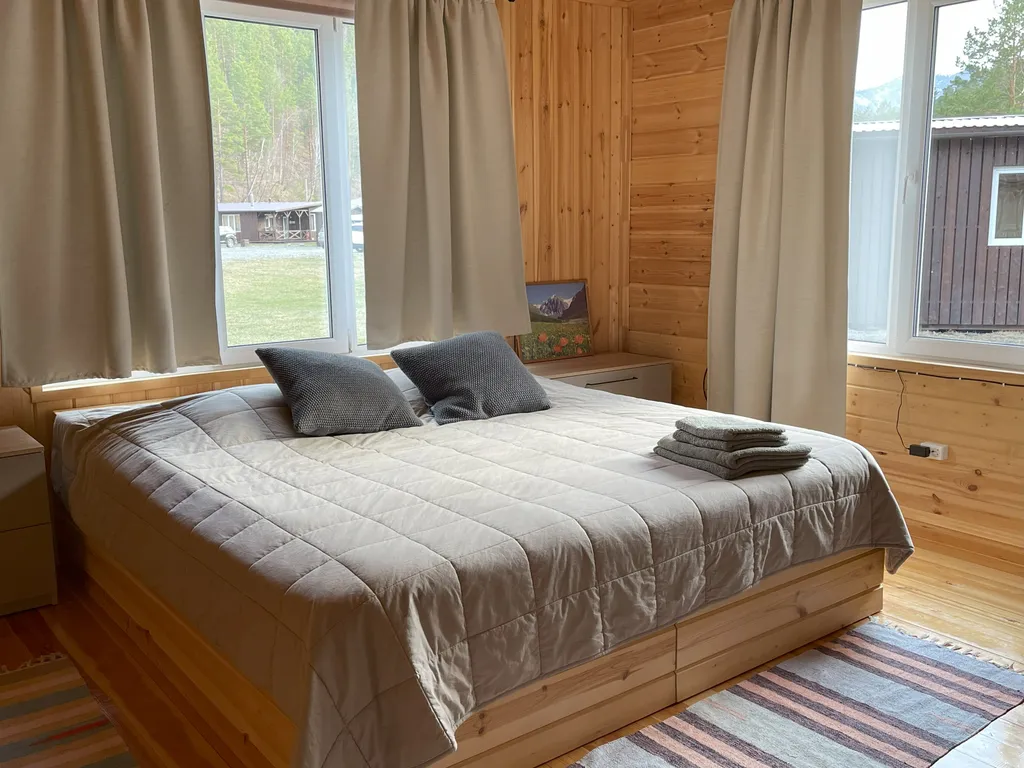 Четырёхкомнатный дом с тремя спальнями, огромной верандой и видом на реку Узнезя. Идеальный дом для большой компании. - Номер рассчитан на проживание 6 человек - Площадь дома 60 м² (с террасой 90 м²) В номере есть все необходимое для комфортного проживания: - Три двуспальные кровати с ортопедическим матрасом шириной 200 см. - Постельное бельё из сатина премиум класса - Ванная комната (душевая кабина, раковина, унитаз, бойлер горячей воды, фен, сушилка для белья, комплект полотенец) - Стиральная машина - Шкаф и плечики для хранения личных вещей, выдвижные ящики под кроватью - Кухонный островок с барными стульями - Холодильник, индукционная плита, раковина, электрический чайник, набор посуды и чайные принадлежности - Зеркало в полный рост - Уличная мебель на террасе - Дровяная печь (можно затопить за отдельную плату) - Wi-Fi - Телевизор (интернет работает не стабильно, поэтому берите с собой флеш-накопители с фильмами и мультфильмами) Курение в номерах запрещено.