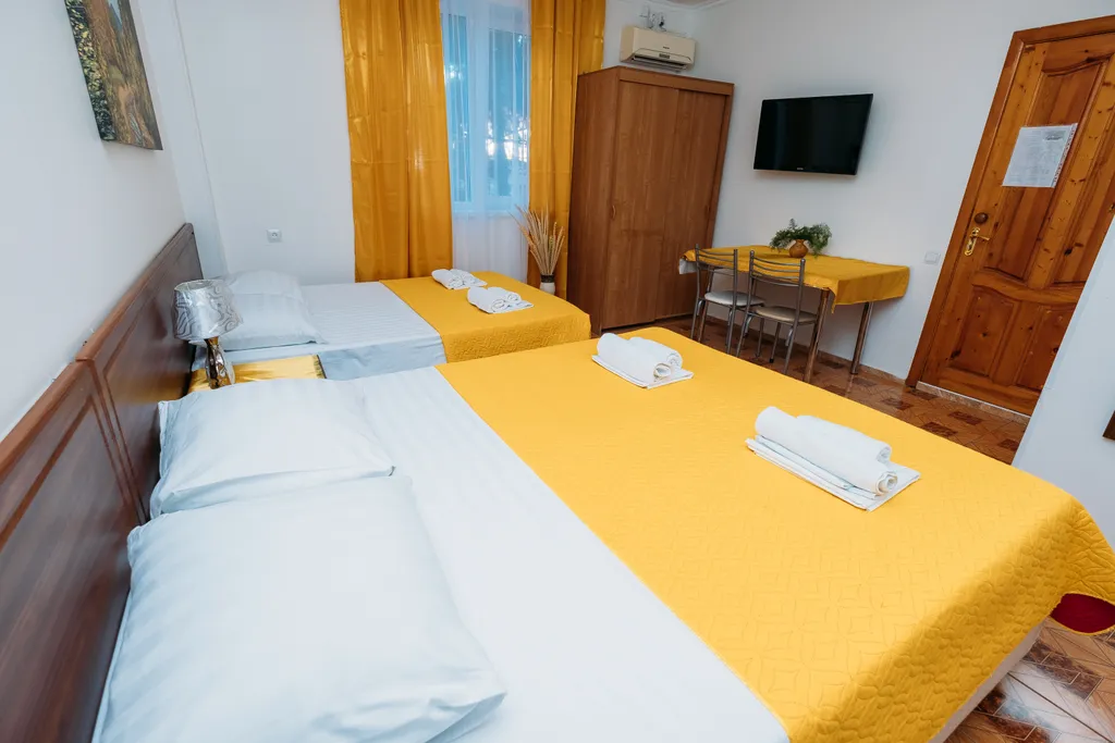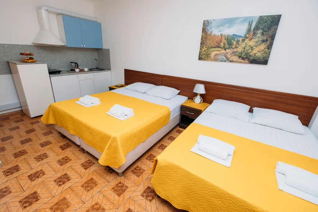4-х местный однокомнатный номер "Студия", площадью 18 кв.м. в номере: на выбор гостя две двуспальные кровати (140х190) или одна двуспальная (140х190) и две односпальные кровати 80х190). В номере - мини кухня, все необходимое для приготовления и приема пищи, вместительный шкаф, тумбочка, стол, стулья; мини - холодильник, чайник; Wi-fi, кондиционер, ЖК TV. Фен по запросу. Сан. узел: душ, туалет, гигиенические принадлежности.