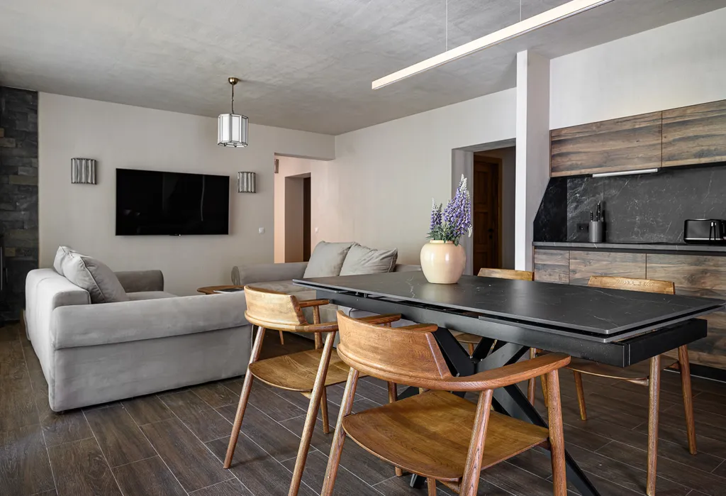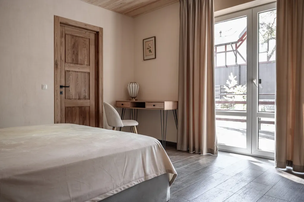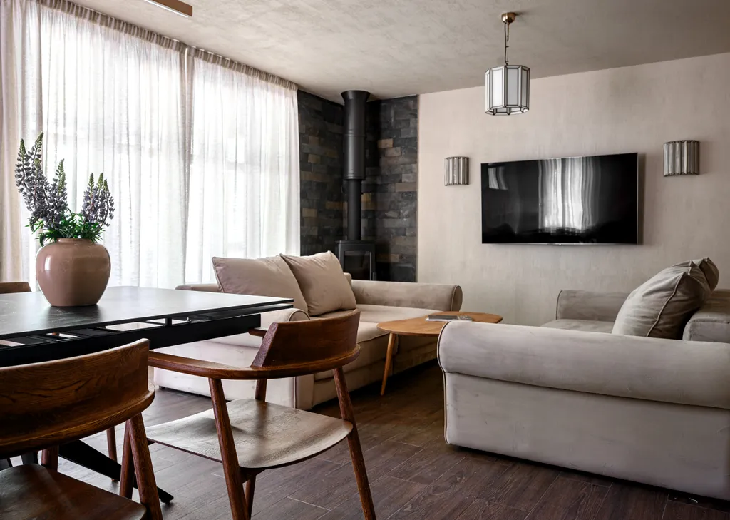 Премиальный коттедж «Шале» — пространство комфорта и уединения Коттедж «Шале» на базе отдыха «Фрегат» — это премиальный формат загородного отдыха для тех, кто ценит пространство, приватность и высокий уровень комфорта. Дом идеально подойдёт для большой семьи, компании друзей или камерного мероприятия в атмосфере уюта и тишины. Главное преимущество коттеджа — четыре просторные мастер-спальни, каждая из которых оснащена собственной ванной комнатой. Это редкое и особенно ценное решение, позволяющее каждому гостю наслаждаться личным пространством и полноценным комфортом без компромиссов. Интерьер выполнен в благородном стиле с использованием натуральных материалов и тёплых оттенков. Большие окна наполняют дом естественным светом и подчёркивают связь с природой. Просторная гостиная располагает к общению, а полностью оборудованная кухня позволяет комфортно готовить и принимать гостей. Для отдыха предусмотрено всё необходимое: 4 мастер-спальни с индивидуальными санузлами Просторная гостин